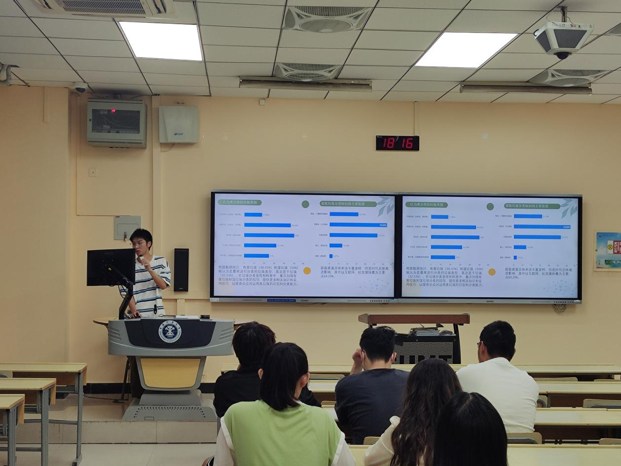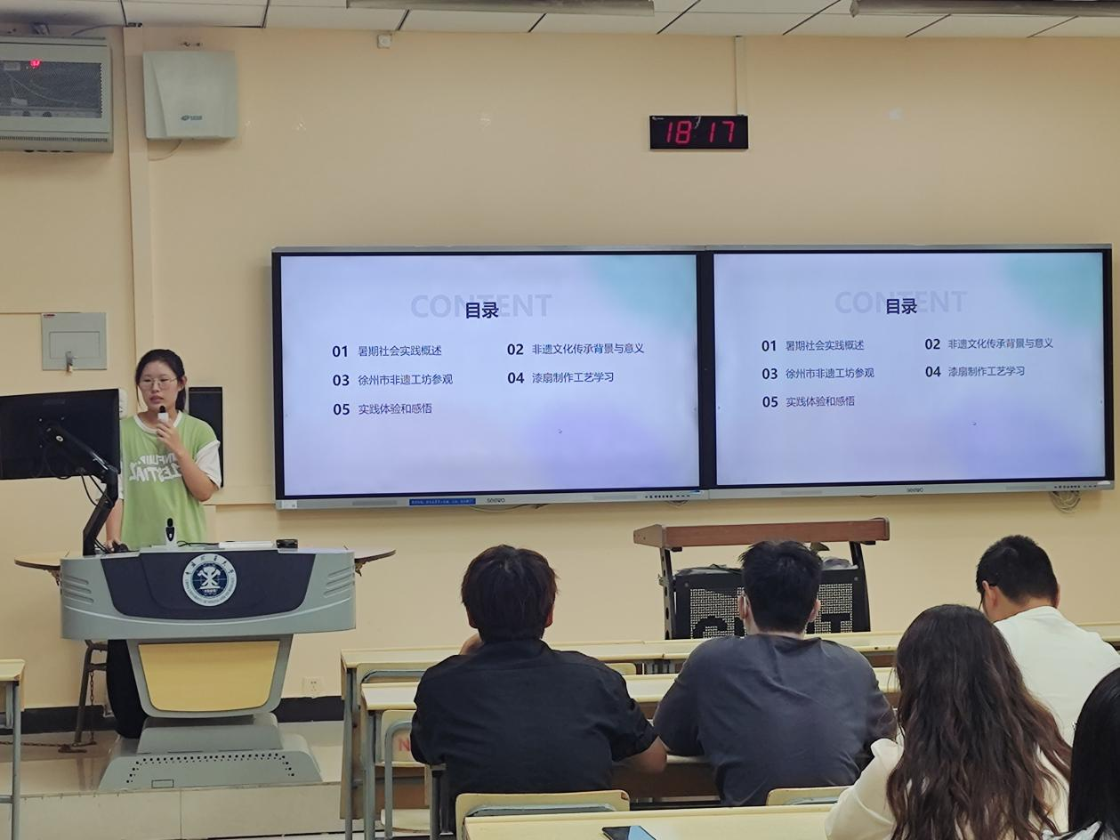本次活动由两位班级团支书同学共同主持,共有三名同学轮流上台分享了自己社会实践的经历。首先由罗莎同学进行了暑期参加一路黔行支教团的支教经历分享,冯咏荷同学向大家分享了徐州市非遗传统文化——漆扇的制作学习与体验感悟,而蒋小龙同学则展示了和团队制作的关于垃圾分类的调研成果。第二个环节同学们一起观看了关于中国药科大学的优秀社会实践的宣传片,学习借鉴优秀团队的实践经历。最后,主持人总结了本次团日活动的主要内容,并鼓励同学们积极参与各种社会实践活动,在社会实践中了解社会、增长才干、锻炼毅力。至此,本次活动圆满结束。