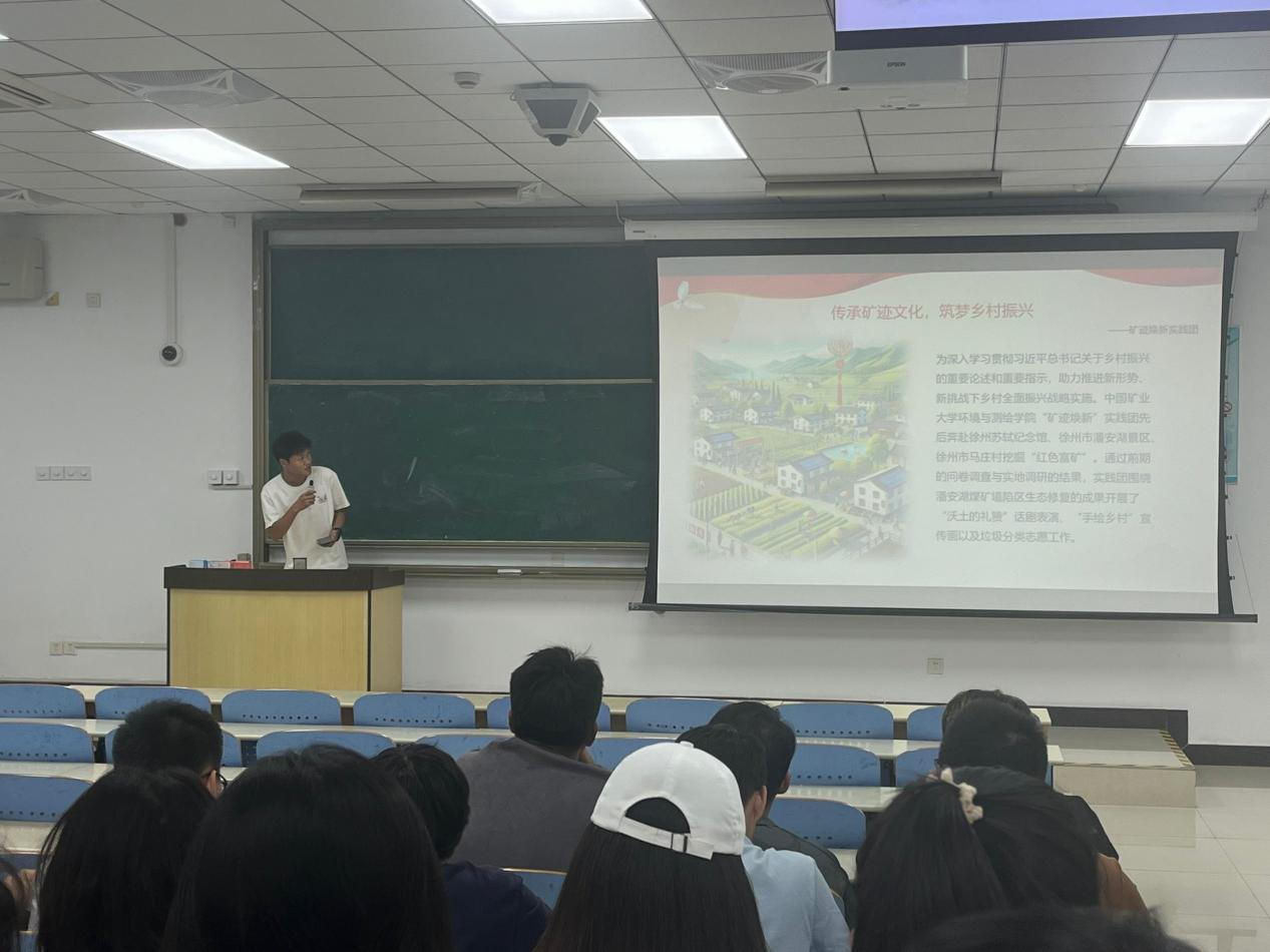本次团日活动由团日活动栾忍同学主持,由两位同学分别上台通过ppt讲解和现场描述讲解他们的社会实践经历和成果。测工1班的王奥松同学分享团中央专项团队“矿迹焕新队”前往马庄村、苏轼纪念馆、潘安湖景区等开展社会实践的经过和实践成果,从中同学们学到了很多,比如和同学的交流效率还有一些工作访谈锻炼了同学的工作组织能力。测工3班的李宗谱同学分享了矿大共青团直播露点