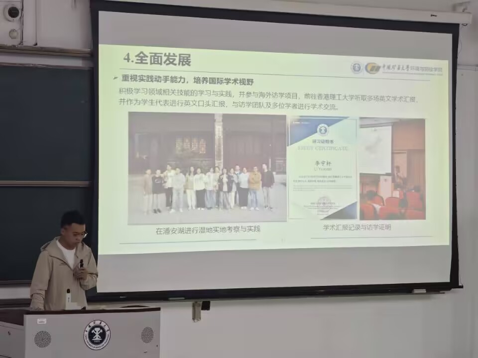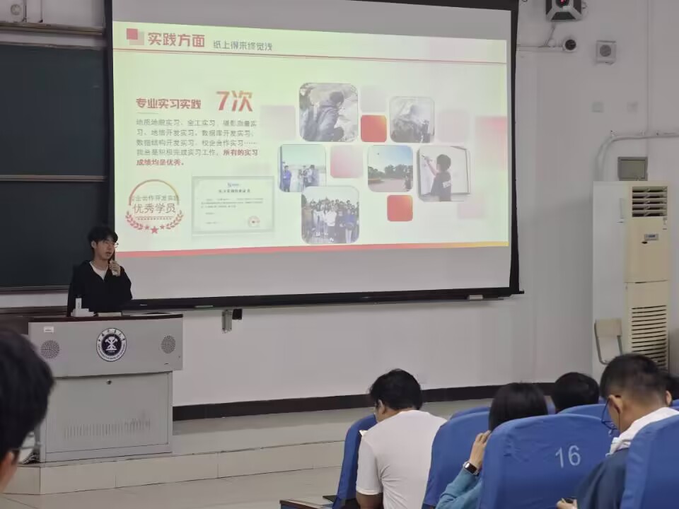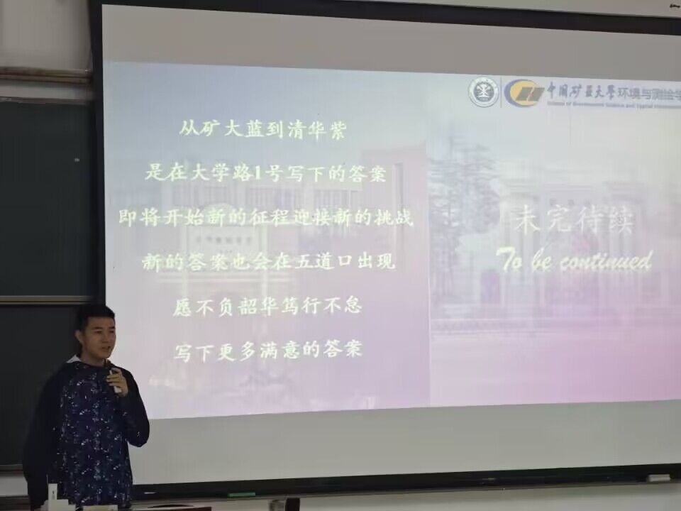 分享会伊始,由主持人介绍活动概况。分享会过程中,胡煜梁学长主要就自身的学习、科研与竞赛经验进行了分享,他主张用“努力”书写在矿大的答案之书,重视科研竞赛,吸取好学长学姐的经验。李宇轩学长就自身的学习和科研经验进行了分享,他强调要重视实践能力,培养学术国际视野。紧接着是谢思语学姐在介绍自己的学习、科研与志愿服务的同时,向同学们介绍了许多实用的博主。最后由杨琪琪老师进行总结,她教导我们:要跟优秀的学长学姐交流,学习他们的经验,重视自身学业发展,不负青春年华。