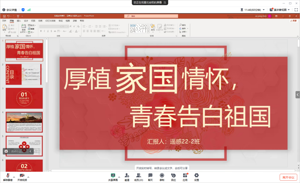 为了回溯中国共产党发展的辉煌历史,加强同学们对于党史的了解与认识,进一步理解中国特色社会主义思想。遥感科学与技术22-2班于2024年10月24日在线上开展以"厚植国家情怀,青春告白中国"为主题的团日活动。