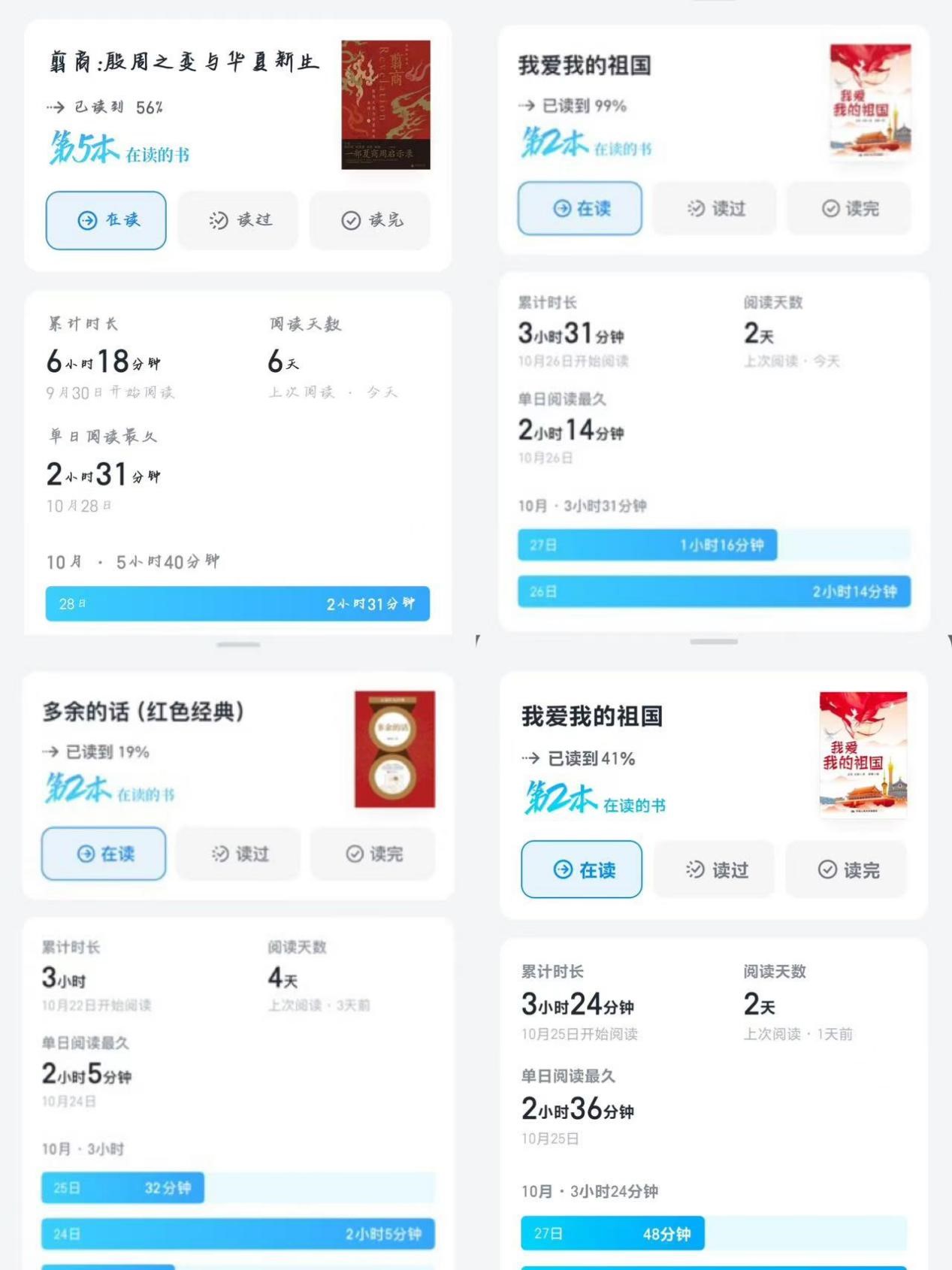 活动中期,参与者选取自己喜爱的有关文化或红色经典方面的书籍进行阅读,《我爱我的祖国》、《红岩》、《红星照耀中国》等书籍纷纷成为同学们阅读的首选,同学们在阅读后加深了对于历史事件以及人物性格等方面的理解,引起了与书中人物、事件等的情感共鸣,纷纷写下自己的感悟。活动结束后,负责人对收集的成果进行统计,细心评估,给出公正的活动结果并进行公示,活动圆满落幕。