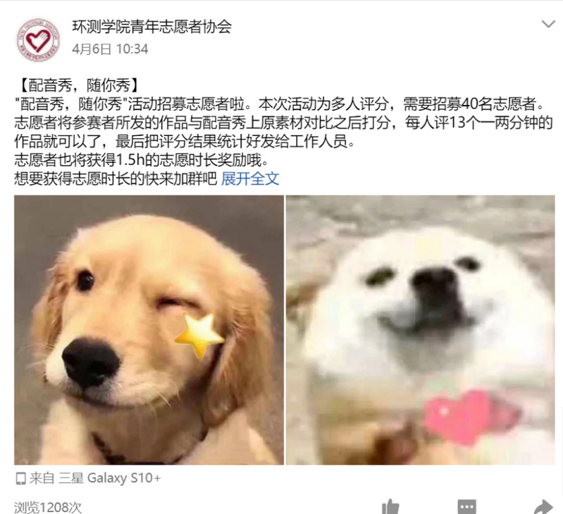 青年志愿者协会举办了“配音秀,随你秀”活动。活动主要内容为参赛者在线上提交外语配音作品,经过评分后根据作品最后的得分情况获得相应的志愿时长。同学们在配音秀上以外语的方式配音,既可以丰富学生的课余生活,也可以使大家通过学习配音学到一定的外语口语技巧。
