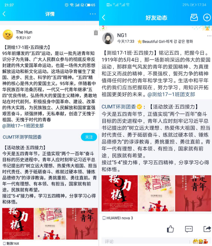测绘17-1班团支部组织了线上讲座学习和自我感悟活动。团支部成员认真研习了下发的学习材料,并以接力的方式在空间发表自己的学习心得,力争做到深刻体会并学习到五四精神,从而以更加高涨的热情、饱满的奋斗精神,为建设祖国的美好未来而不断奋进。