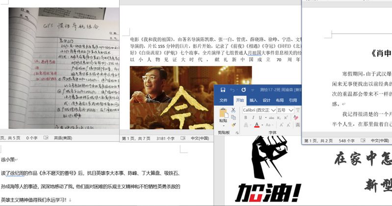 在此次团日活动中,有的同学阅读了自己闲置很久的书,有的重温了喜欢的电影,也有的为自己制定了学习计划,还有的同学选择用视频的方式记录了生活中的几个瞬间。“不积跬步无以至千里”,“千里之行始于足下”,在这个与众不同的假期里,大家以不同的方式感悟生活,充实自己,同时也为全国各地的一线医务工作者加油,为武汉祈祷,为防控疫情工作默默做着自己力所能及的贡献,一起期盼着春暖花开,疫情早日结束。