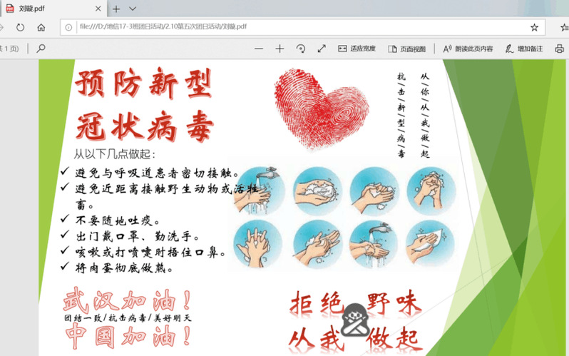 虽然本次团日活动因为疫情而局限在家中,但也因此显得尤为特别。我们看到了许多奔赴海外采购口罩的人们,看到了许多把自己的积蓄捐献出来、用于救灾的老人们,看到了许多不顾一切前行的逆行者们。我们知道,我们能平安的生活,是因为有人在替我们负重前行。至此,我们只想说,加油武汉,加油中国!