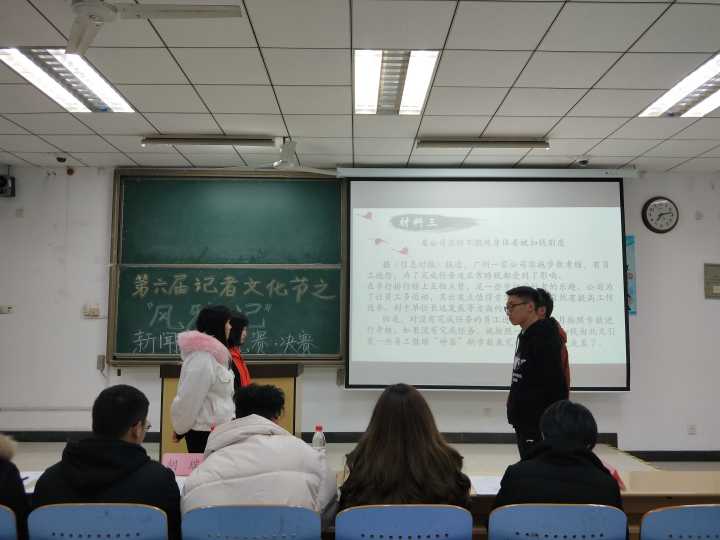 比赛开始前,由初赛成功晋级的11支队伍到场进行抽签,并编排比赛顺序。晚7点,比赛正式拉开帷幕,首先由主持人向各参赛队伍介绍评委组成员及相关比赛流程。在“采访模拟”环节中,参赛队伍需两两结对,并简述自己分得的材料,随后互相进行提问。每一位参赛选手都充分发挥了自己的才能,并以优秀的表现赢得了阵阵掌声。第二个环节中,参赛队伍根据同一视频撰写了新闻稿,并依次进行播报。各位评委对两个环节分别进行评分,并详细地对面每组的表现进行了点评。