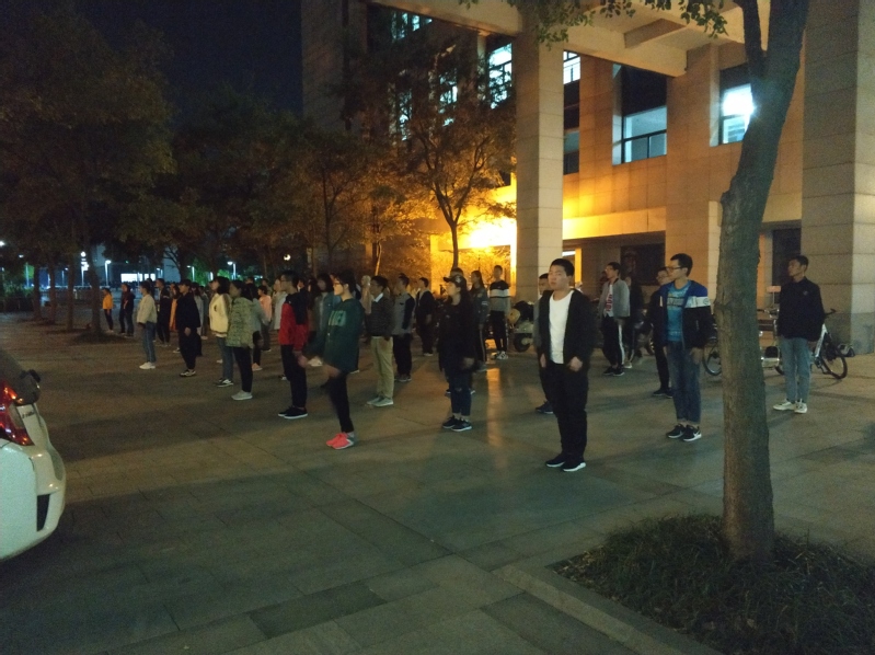 广播体操队全体成员在图书馆一旁空地上进行训练,此次训练旨在为即将到来的直播露点