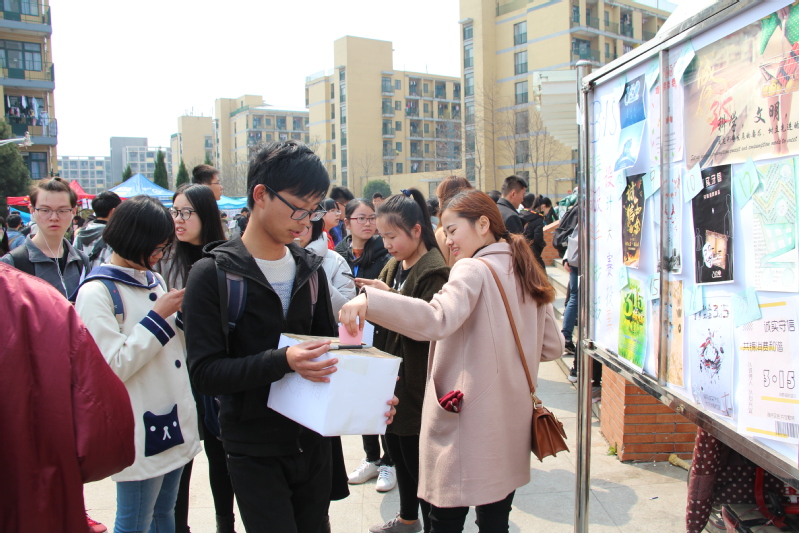 的学生会生活部同学将所有参赛作品张贴在展览板上供同学们观赏,而每位参与投票的同学都有两票来投给自己所青睐的作品。本次线下投票活动与微信公众平台的投票活动相结合,然后按照三比一的比例进行汇总,最后通过投票数来排名赋分,而统计完成绩之后的各组,排名前50%的进入最终决赛。