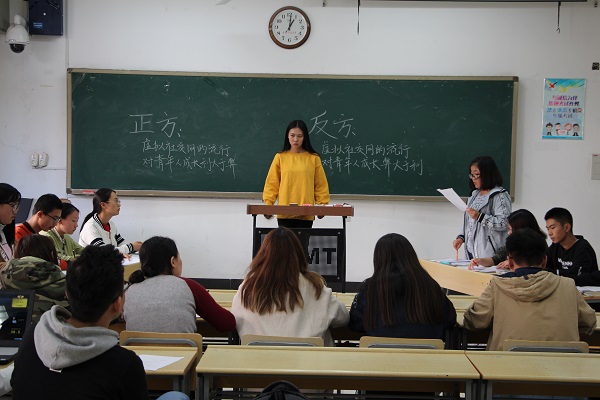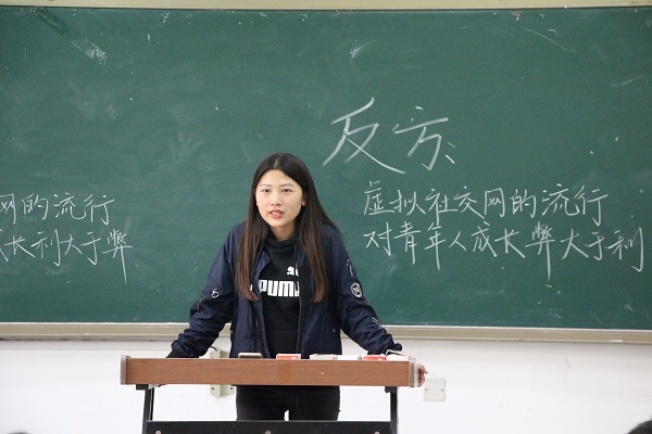 17级辅导员李月和16级兼职辅导员杨琪琪以及往届的优秀辩手担任评委。环境三班与环境五班辩论队赛以“社交网络对青少年的身心健康的利弊”为辩题争夺冠军。