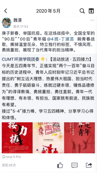 环境19-4班于5月4日开展了以线上交流为主题的五四青年节团日活动。本次活动旨在引导广大团员青年深入学习实践科学发展观,进一步弘扬爱团、爱党、爱国精神。