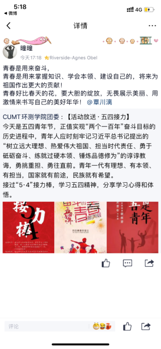 本次活动中,同学们认真学习了五四相关知识,并在网络平台上以传承接力的形式分享自己的学习心得和体悟。在这个过程中,同学们了解到了:在一百年前,一批身处乱世的大学生胸怀天下,秉持着“为中华之崛起而读书”、“天下兴亡,匹夫有责”的信念,他们不畏帝国主义封建主义,不畏军阀迫害,在1919年的5月4日,毅然决然地发动了震惊中外的“五四运动”,使中华青年的蓬勃朝气在历史上留下了深刻的一笔。