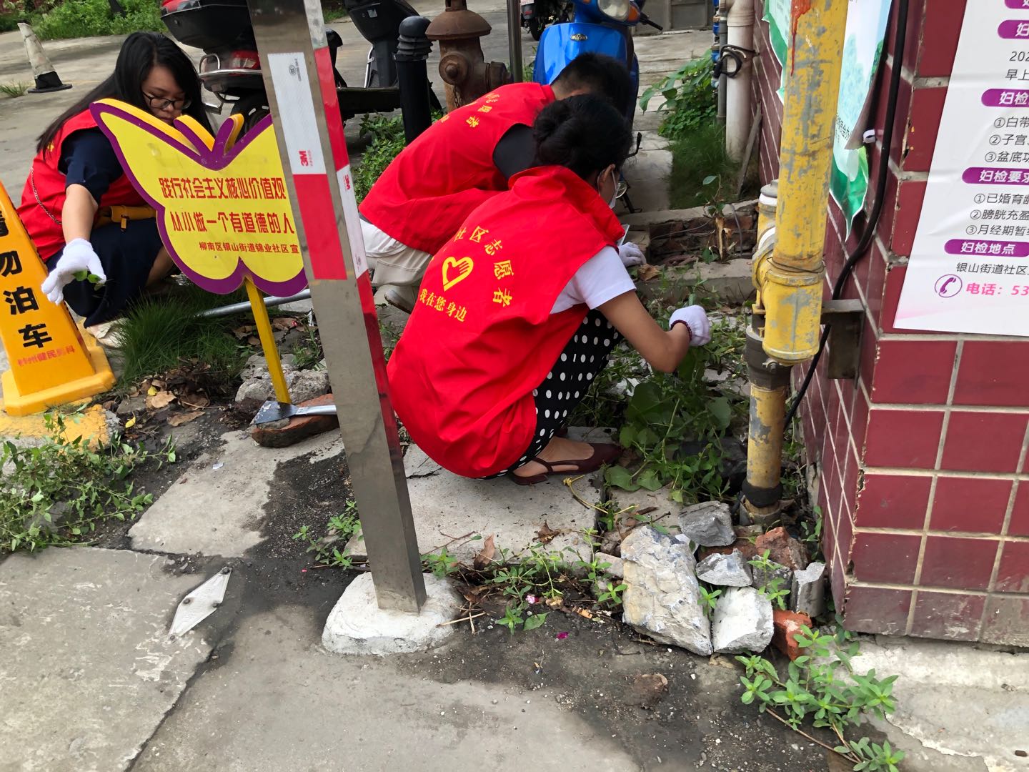 首先,看到社区花圃里的落叶及垃圾太多,脏乱不已,韦旋薇第一小组的志愿者们就顶着杂草和蚊虫一点点地把花圃里的落叶及垃圾清扫出来,使原本脏乱的花圃变得整齐而美观。随后又开始用镰刀将杂草细细修理,拿着小铲子将社区墙壁上的小广告铲除。刘慧书记还交给了志愿者们一个小技巧:铲除不掉的小广告可以用水壶装水将小广告喷湿,这样就可以更轻松地铲除。