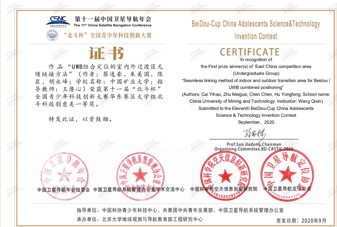 王潜心老师指导,蔡逸豪、朱美国、陈臣、胡永峰同学完成的参赛作品《北斗/UWB组合定位的室内外过渡区无缝链接方法》获得“北斗杯”全国青少年科技创新大赛全国总决赛三等奖。