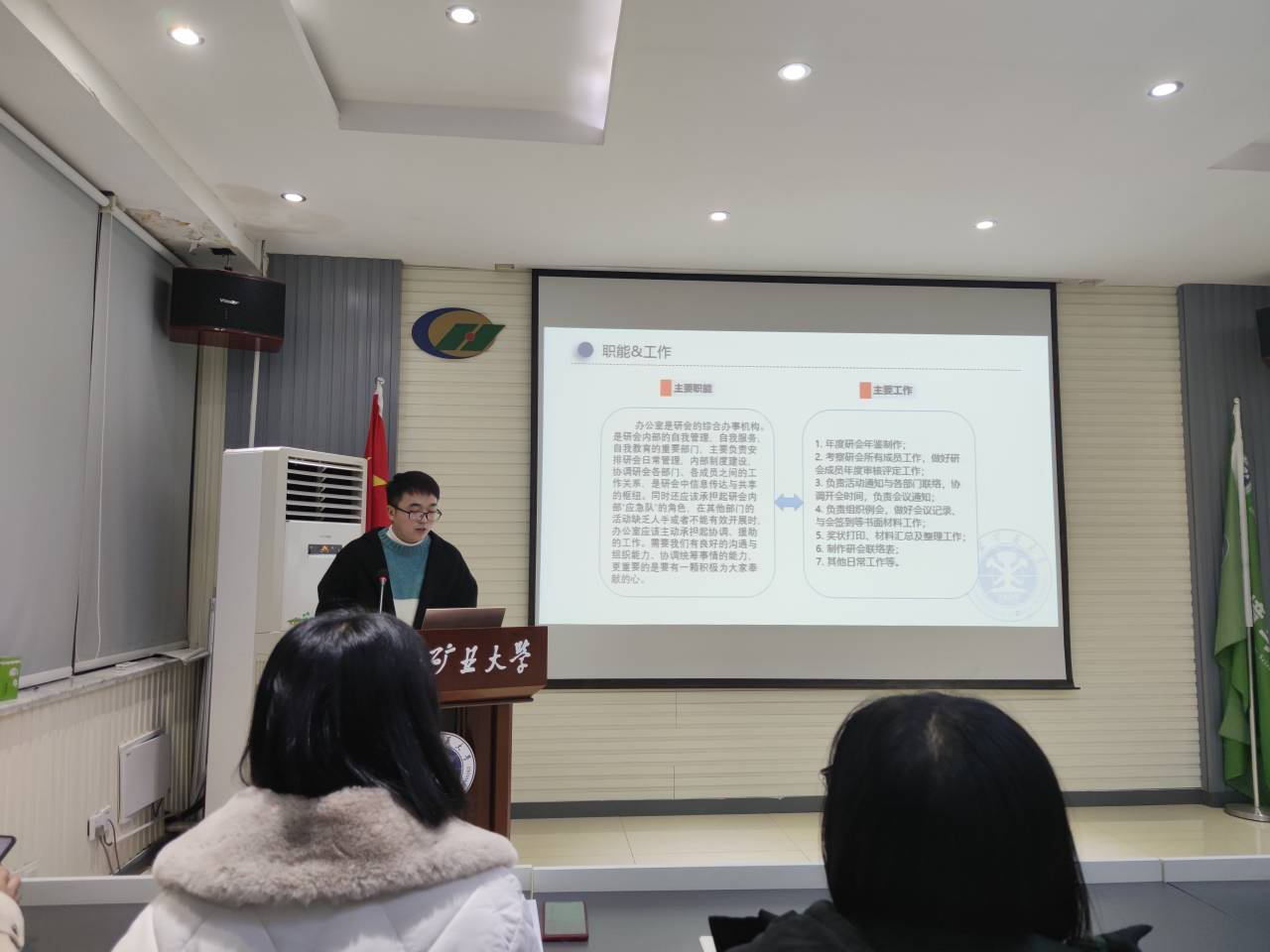 最后,研究生会主席邱欢向各位同学介绍了优秀研究生会的评选条件,并且逐条进行分析,明确的指出下半学期院研会应该努力的方向,距离优秀研会还有哪些不足,应该向哪些方向改进。执行主席朱宁发表讲话,鼓励各部门之间加强协作,改正不足。