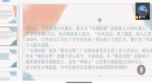 的三位评委线上向选手展示时政新闻材料,要求选手在规定时间内作出认知陈述,回答评委的相关问题,综合考察选手的思想道德品质、思辨表达能力。