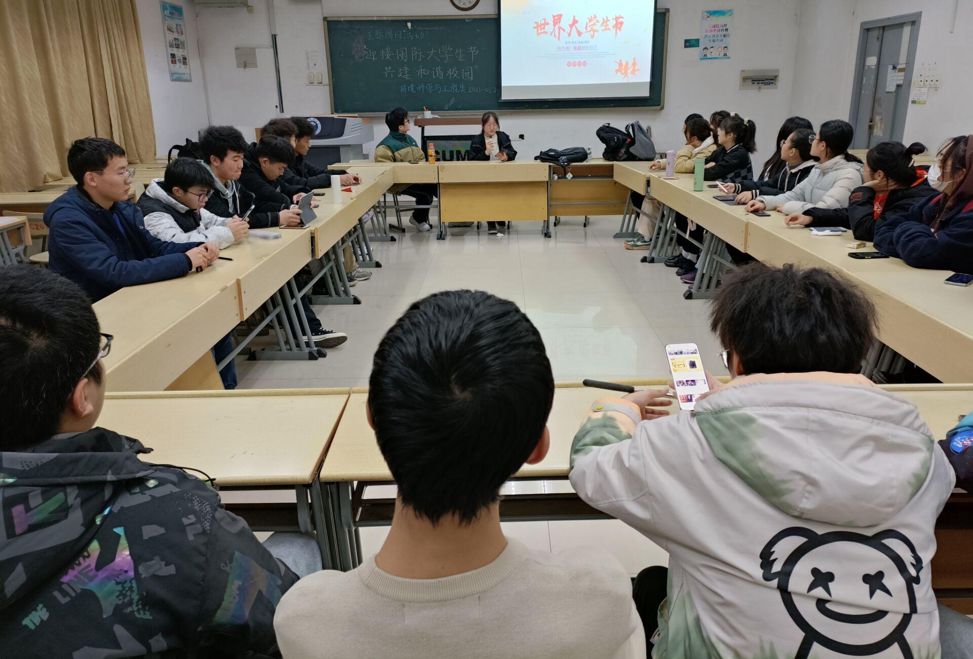 环境类21-2班在博四C206举办“迎接国际大学生节、共建和谐校园”主题团日活动。
