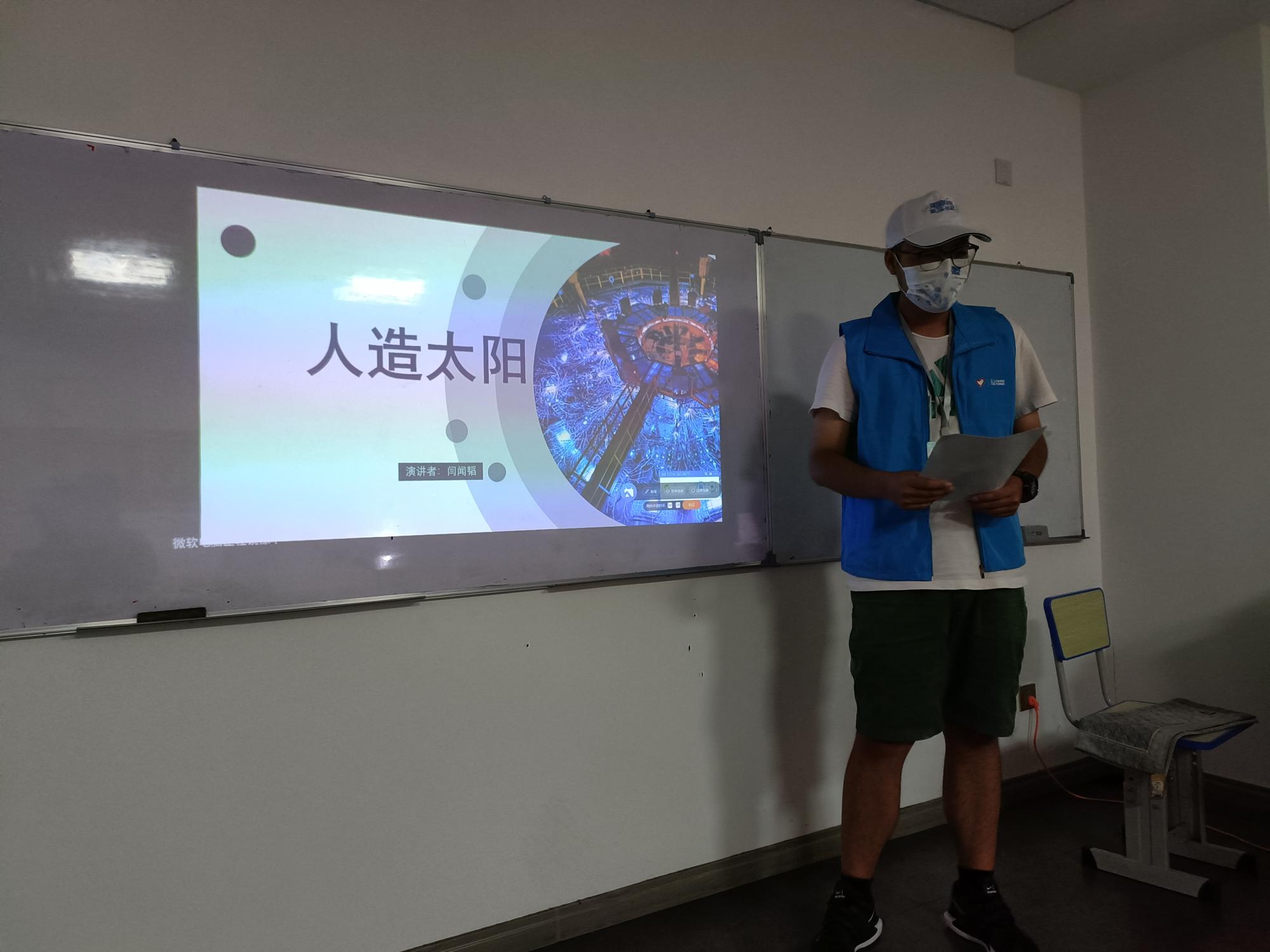首先,讲师以《种太阳》儿歌开篇,用幽默的语言引导大家到人造太阳和种太阳的区别后,他详细介绍了人造太阳应用的原理——核聚变以及核聚变的优势,即清洁和无污染。其次,讲师介绍了制造人造太阳所利用的“磁约束”原理,并通过展示人造太阳运行的动态图,详细讲解了人造太阳的构成以及各部分的作用。他提到,中国“人造太阳”的发展现状——在一亿度下运行100秒、持续放电1000秒,充分展示我国核工业技术位于世界前列,而核聚变也会在日后的能源危机问题中发挥巨大作用。最后,讲师为大家播放了一段介绍人造太阳的视频作为本次宣讲课程的收尾。宣讲过程中,实践团队为大家发放相关读物以帮助理解核工业核能知识,各位听众相互传阅。最后,讲师为大家发放调查问卷,用以反馈大家的听课效果并对讲师的讲课过程提出建议。