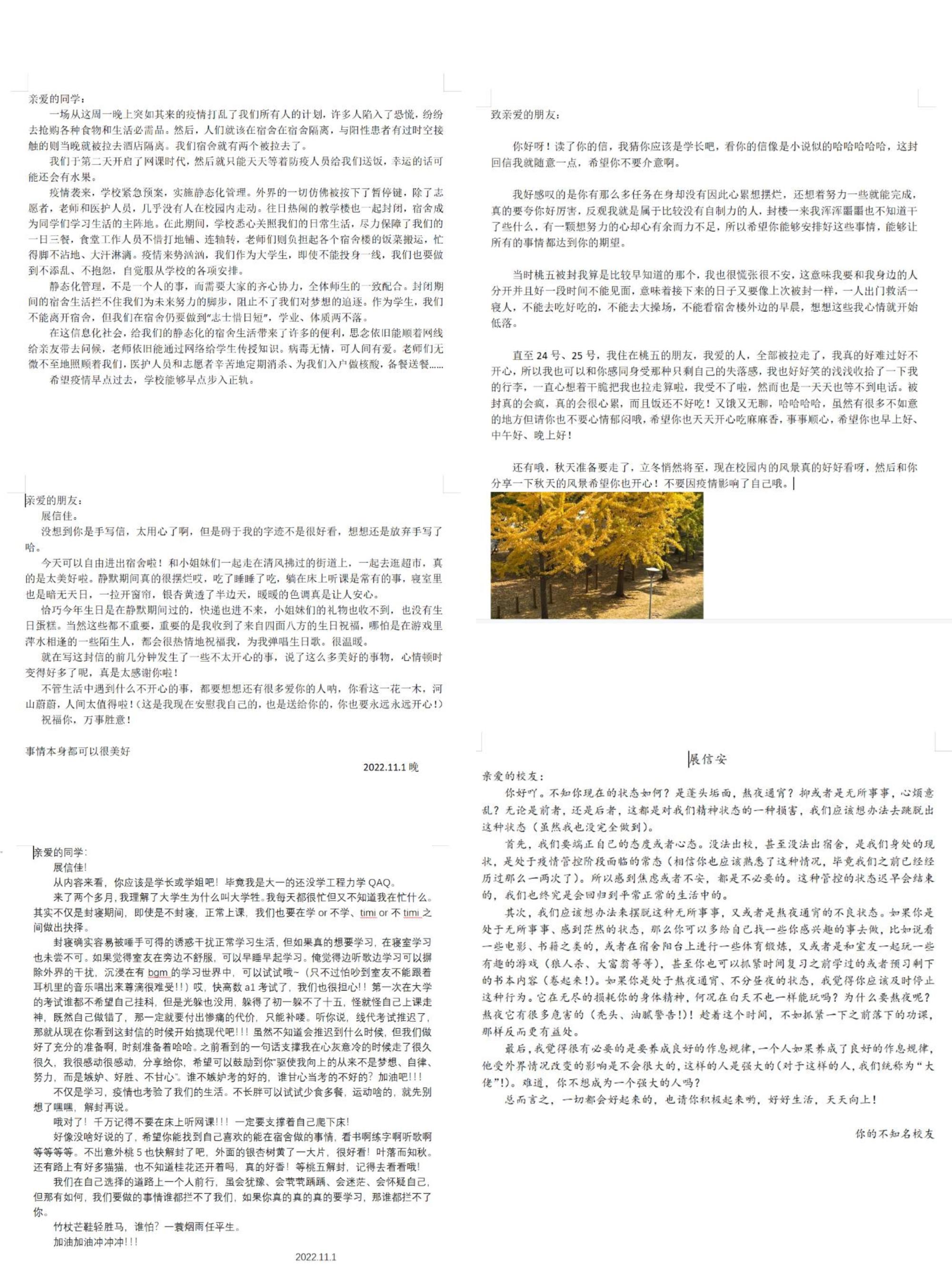 活动将收集到的信件编号,以匿名的方式发送给参与的同学,随后再将收到的回信以同样的方式发送给对应的同学。信件的内容多样,有同学们对疫情的无奈,但更多的是众志成城的对抗疫情信念;有的同学的生日遇上了不幸的疫情,但四面八方的祝福和热情的生日歌使这个生日更加深刻;有的同学对过往景色的回忆,但更多的是对战胜疫情后生活的期待。同学们在往来的书信中互相鼓励,抛去了不快乐,得到的都是互相的关心,就像信中写道的:“竹杖芒鞋轻胜马,谁怕?一蓑烟雨任平生。“