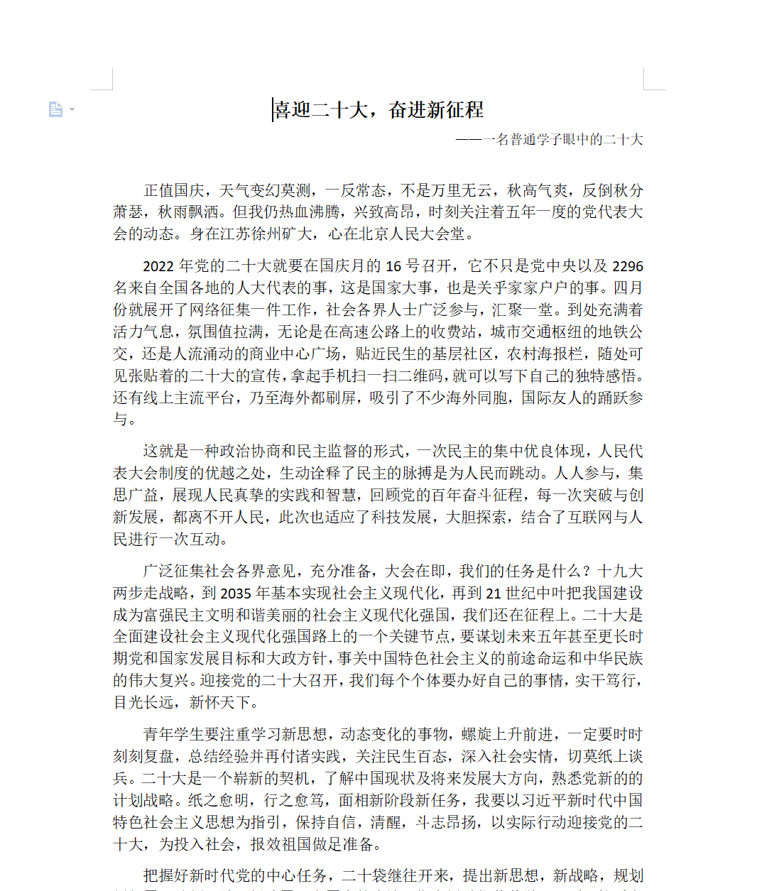 党的二十大的胜利召开引发了同学们的深刻思考,其中大多数作品客观描述了大学生眼中的党的二十大,从对大会内容的回顾引出青年人应当肩负的责任与担当,最后用理性的眼光看待问题,分析出青年人应该守正创新,坚定信念才能成为心系国家的栋梁之才。另外,投稿的作品数量较多,也体现出同学们对国家大事的关心程度,体现大学生应有的家国情怀。尽管内容不尽相同,但都表现出同学们对党的二十大胜利召开的期待与喜悦之情。