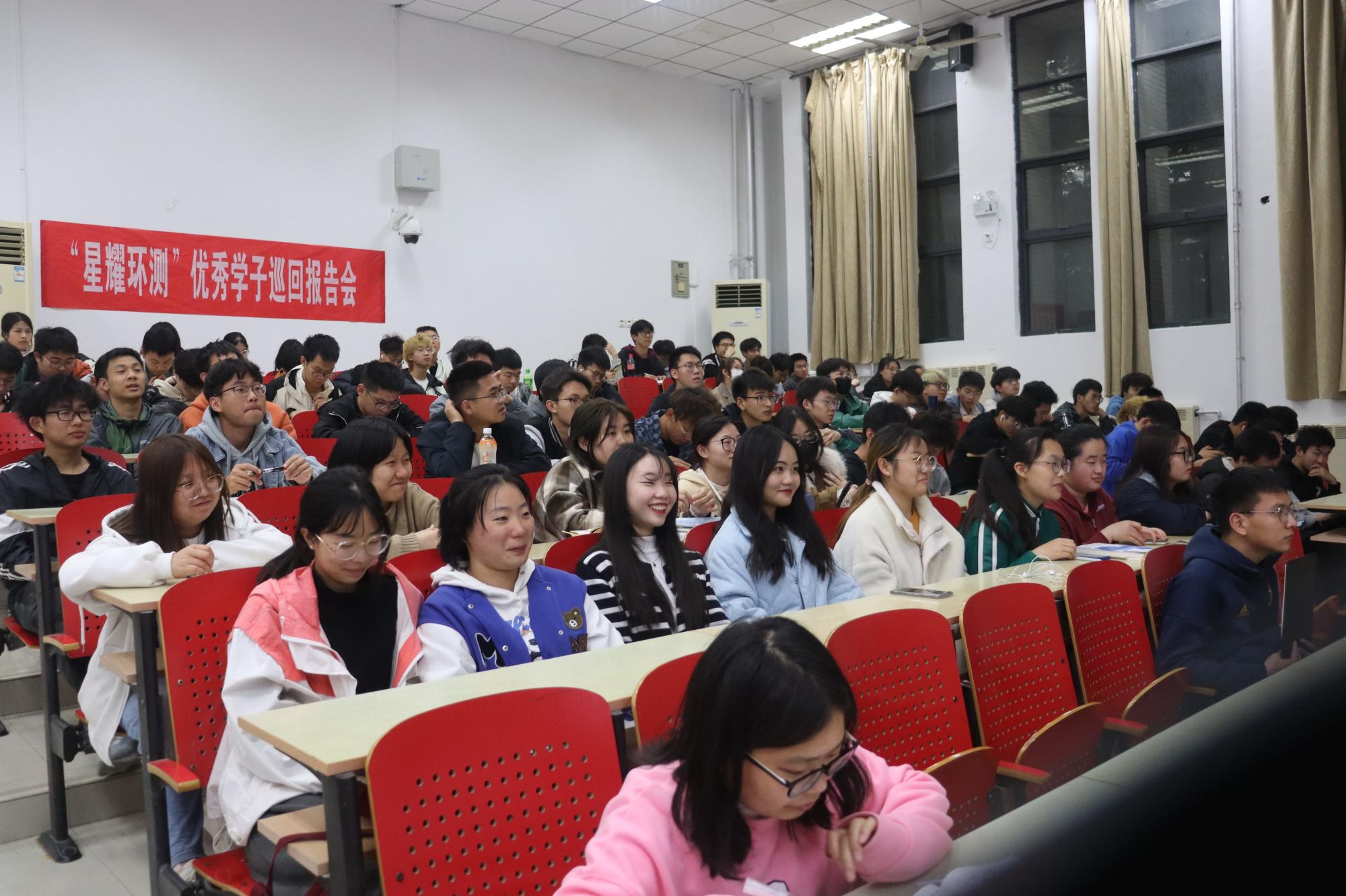 于4月24日晚上7点于博二C101举办“星耀环测”优秀学子巡回报告会环境类专场。辅导员蔡臻、李艳萍,优秀学子胡煜梁、王生璞、陈诗琳、刘昶出席活动。