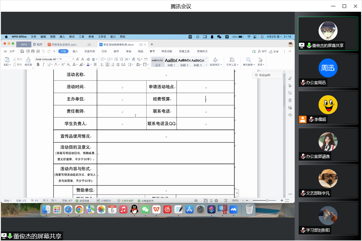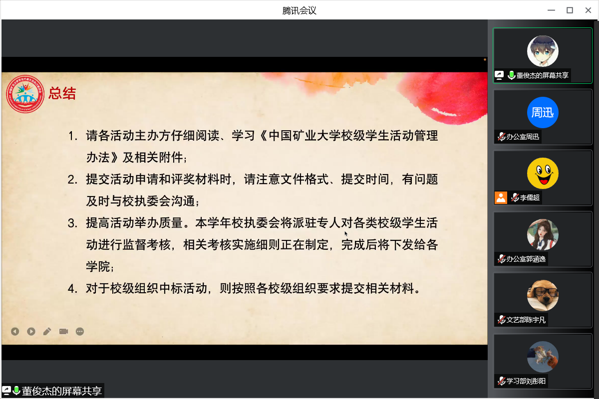 为加强学生干部建设,推动新学期学生工作平稳运行,2022年9月5日晚9点,直播露点 学生会第23届主席团、部长团和干事在线上召开了学生会第一次全体会议。 会议第一项:校学生代表大会执委副主任董俊杰对校级活动申请阶段、活动评奖阶段、场地和宣传品审批等流程进行了详细的介绍,有助于学生会各位成员学习并总结经验。