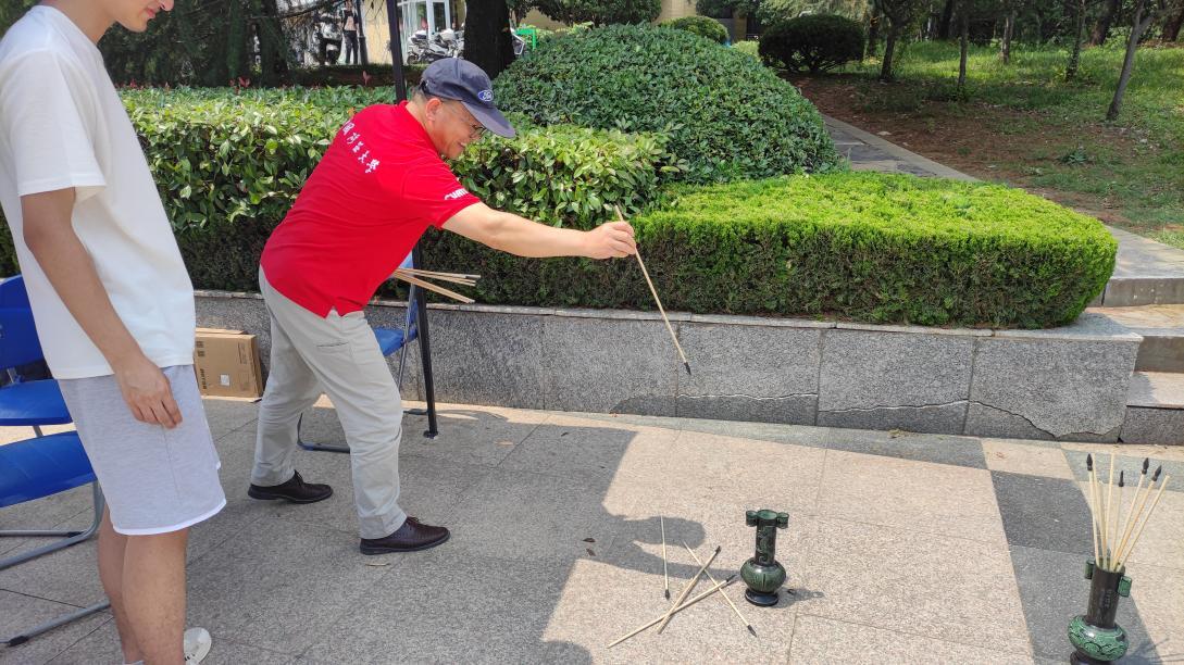 “投壶之礼——我与导师有约”采取线下活动的方式,鼓励同学们邀请导师一同体会中华传统文化、分享人生体会、推荐精品书目、探讨学术前沿,为研究生和导师之间架设了一道学习与沟通的桥梁,帮助广大研究生学习到更多精彩纷呈的学术知识,收获更为丰富的文化体验。活动现场吸引了包括老师、学生和后勤工作人员等众多人参与。活动中,每位参与者可投掷十只箭,在距离壶1.5米处进行投掷,掷完为止,箭投进壶中加两分,投进侧边加一分,未能投进不加分,并按总分进行奖励。