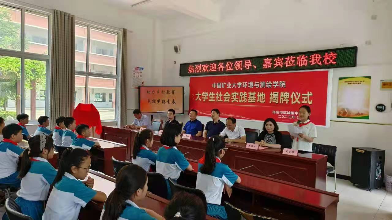 此次揭牌仪式由邳城镇中心小学副校长刘敏主持。活动伊始,刘校长向到来的领导和志愿者们表达了欢迎与感谢。紧接着汤相普局长致辞欢迎,高度赞扬了矿大师生们的奉献精神。随后,王守刚书记讲话,介绍了矿大的历史,希望中心小学有更多的学生在未来能够相聚矿大。之后,惠祥东校长致辞,讲述了中心小学的发展历史并对直播露点的未来提出展望,期待支教团与学生们能有一段美好经历。然后是支教团代表惠智杰同学发言,表达了自己的教育梦想。邳城镇中心小学学生代表卢润青表示要通过努力学习,争做一名优秀的学生。最后,汤相普局长与王守刚书记为大学生社会实践基地揭牌。