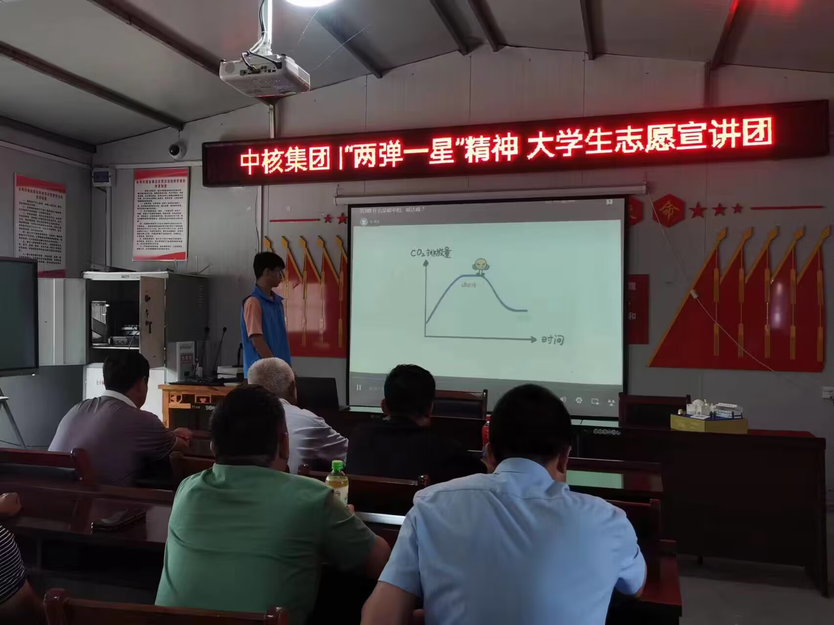 在宣讲活动中,吕贵同学将PPT演示和演讲结合,从碳中和的主要概念、实现碳中和的方式两部分分别展开阐述。在演讲过程过,演讲者通过图文结合的方式生动展示了碳中和的原理和方式,同时团队内的其他成员也在积极组织维持会场良好秩序。在宣讲过程中团队指出,结合当今的国情,减少碳排放需要从四个方面入手——加大清洁能源结构占比,加速各行业电气化进程,减少非必要的能源消费量,使用碳汇集或移除技术等措施都能够有效实现碳中和的目标。