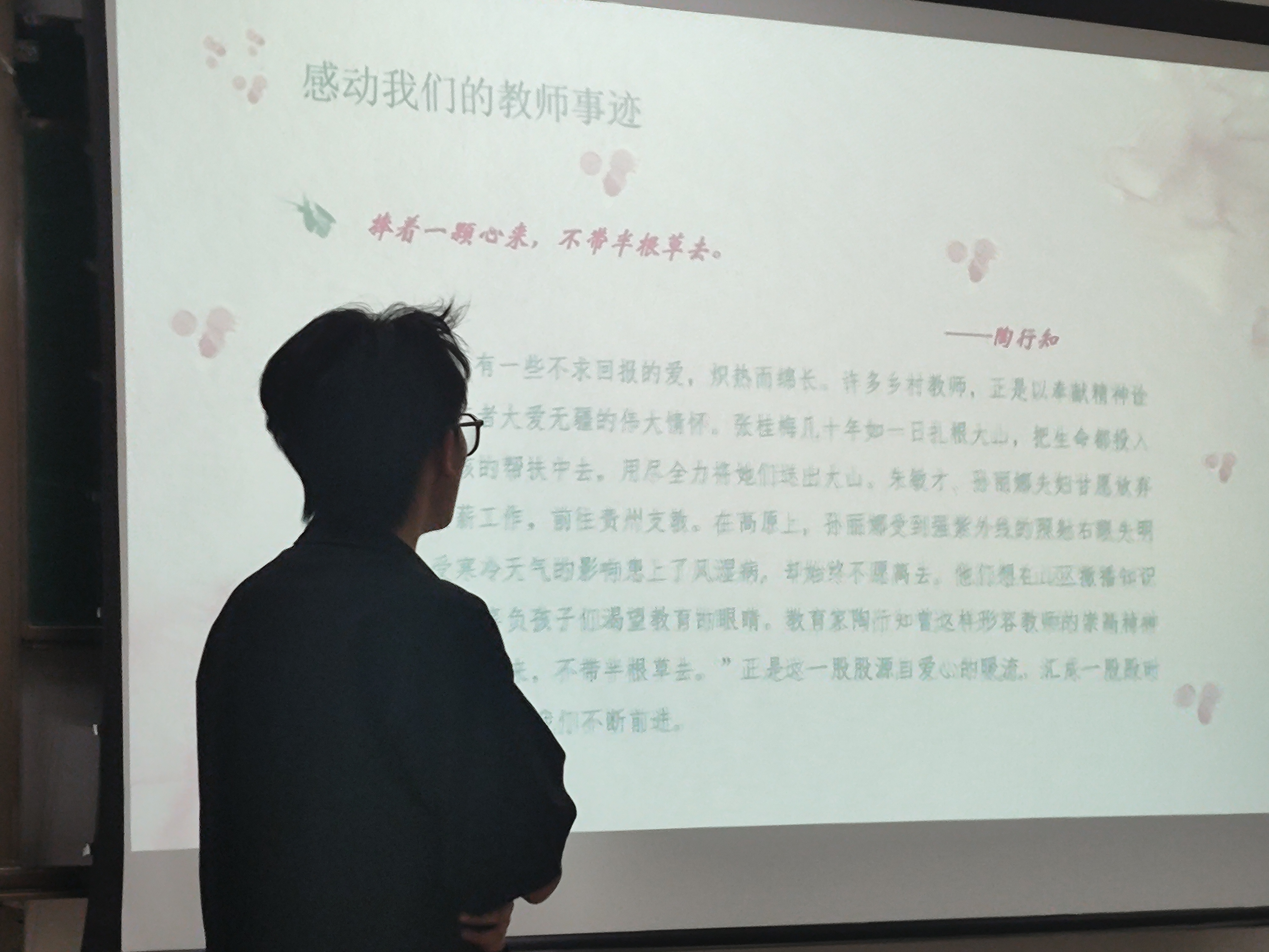 在本次活动开始,由地信一班李自信同学引出了本次团日活动的主题“师者如光,照亮人生”,然后简单介绍了教师节与一些感人的教师事例,在讲解过后,他通过一个视频介绍张桂梅校长的事例,加深了我们对她乃至整个教师这一职业的认识。在视频之后,他介绍了一些教师节的名人事迹,加深了我们对教师节的印象与认识。最后,他总结了教师节的重要性,和教师为孩子们所做出的重要作用,并表明了自己也有当教师的心意。