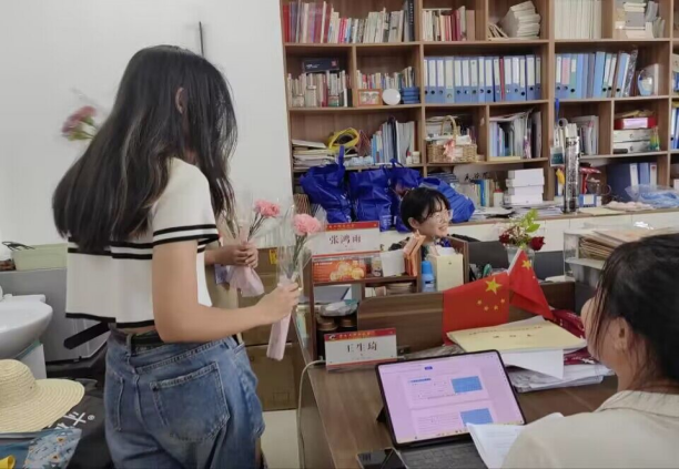 9月8日下午,学生会主席团、部长团前往教学楼为老师送上节日问候和祝福。他们手执鲜花,双手递给老师以感谢老师一直以来的照顾和培养,老师在收鲜花的同时也对同学们表示感谢并叮嘱我们不断完善自我,追求卓越,成就更优秀的自己。