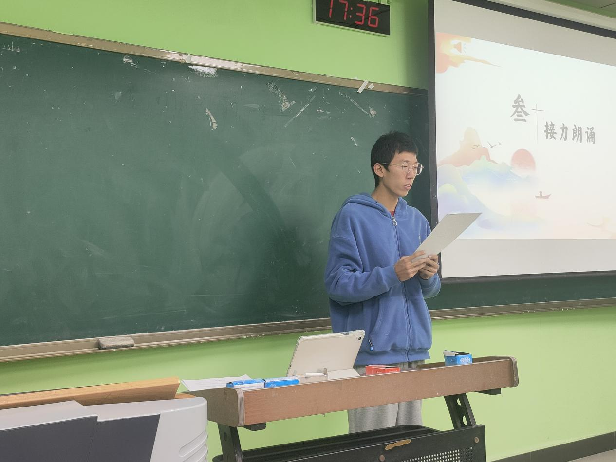 本次活动以号召同学们从党史中汲取力量、不忘初心、砥砺奋斗,更好的传承和发扬党的伟大精神为目的。活动分为四个环节,第一环节由代常磊同学进行“百年党史·砥砺前行”主题演讲,代常磊同学演讲铿锵有力,慷慨激昂,引发了同学们对党史的感触,调动了同学们对党的崇敬和自豪。第二环节,团支书组织同学们进行“历史事件猜猜猜”游戏,同学们抽取一些描绘了党史中的重要时刻的图片,由同学们说出其对应事件和意义,在这个活动中加深了同学们对党史的深刻了解,游戏结束后团支书播放记述了党史中重要时刻的视频,增进同学们对党史的理解,唤起了同学们对党的自豪感。第三环节为接力朗诵,由李斯嘉同学领诵,每位同学各朗诵一句抒发爱党、为党自豪的诗句,并以视频形式记录。最后一个环节,同学们共同歌唱《我们走在大路上》,在悠悠歌声中抒发对党史的了解、热爱、骄傲,也在这歌声中结束了本次团日活动。