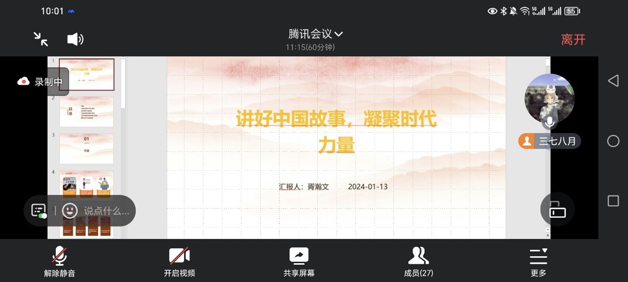 活动伊始,团支书通过PPT简要介绍了本次活动的流程,接着用三个视频资料向大家讲述具有代表性的中国故事。接下来,胥瀚文讲述了山河四省关于介绍自省文化的“内卷行为”,间接体现中国故事的内容丰富和中国文化的博大精深。最后,他介绍了为什么要讲好中国故事以及如何讲好中国故事。