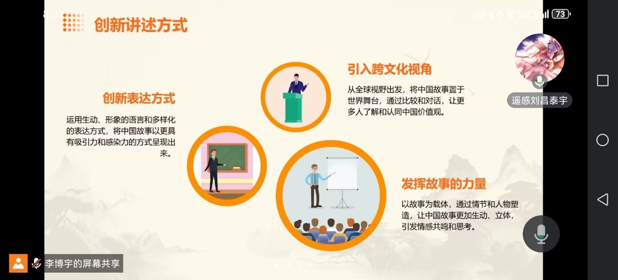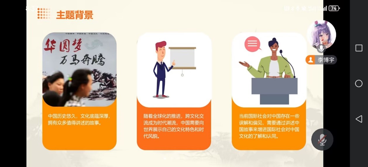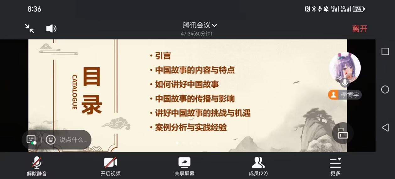 此次活动分为六个部分,第一部分引言,班长李博宇带领大家了解此次主题的背景和意义;第二部分其讲述了中国故事的内容与特点,给大家分享了中国历史文化、现代发展成就、中国传统价值观,引人入胜;第三部分关于如何讲好中国故事,李博宇分享了自己的看法:创新、结合时代背景、合理运用新媒体平台;第四部分为中国故事的传播与影响,第五部分为讲好中国故事的挑战和机遇,第六部分向同学们分享了案例分析与实践经验。向大家分享中国故事,能够有效增强同学们的文化自信,凝聚更加强大的时代精神。
