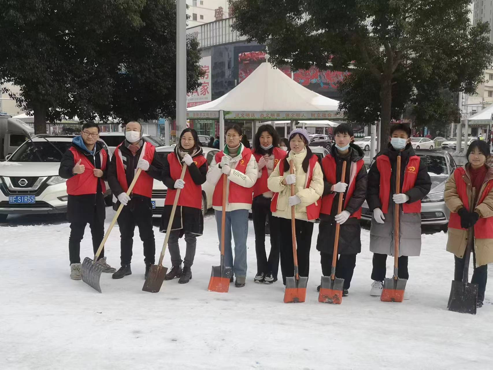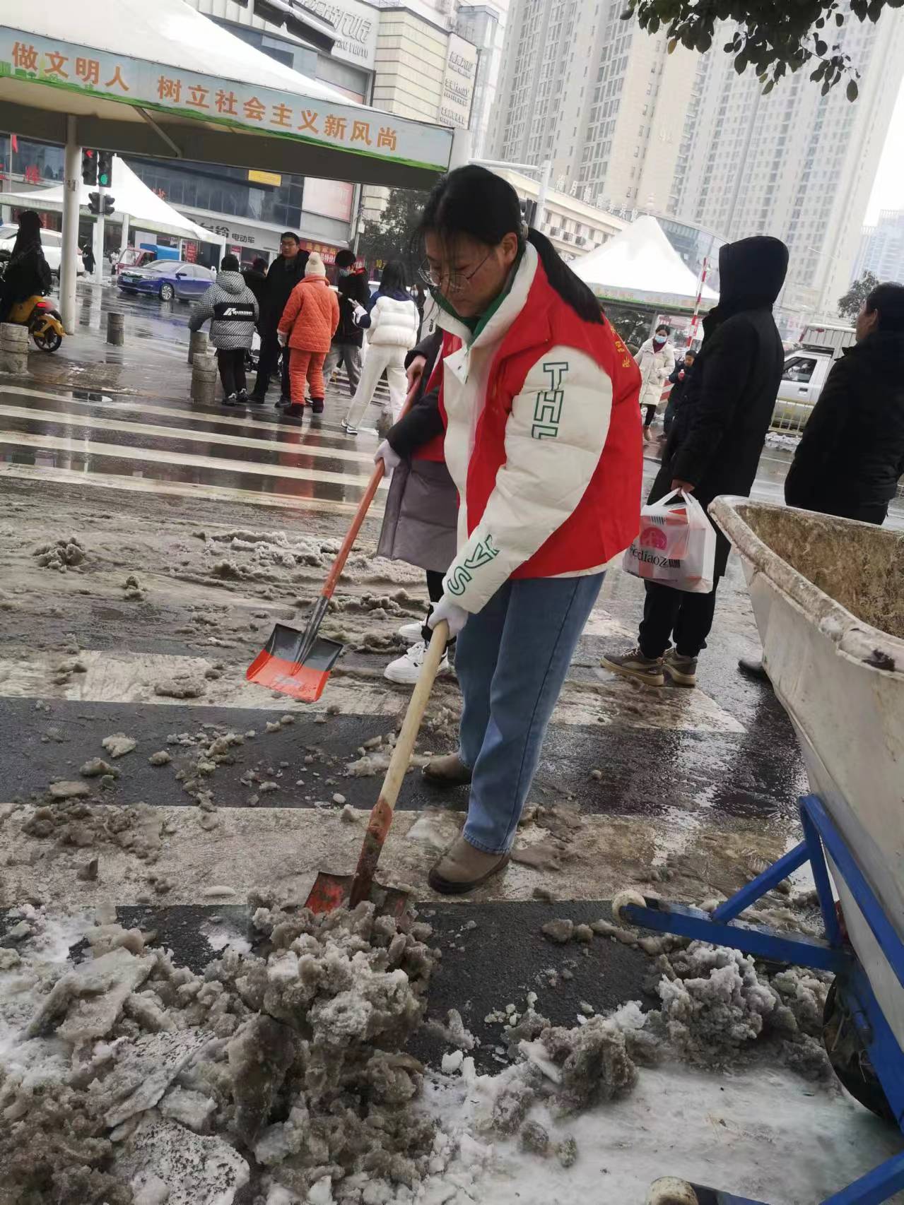学子杨玲晶来到湖北省枣阳市汽车站附近开展了一场暖冬除雪志愿服务活动。为市中心的行人道路清除积雪及冰层,确保市民出行安全。