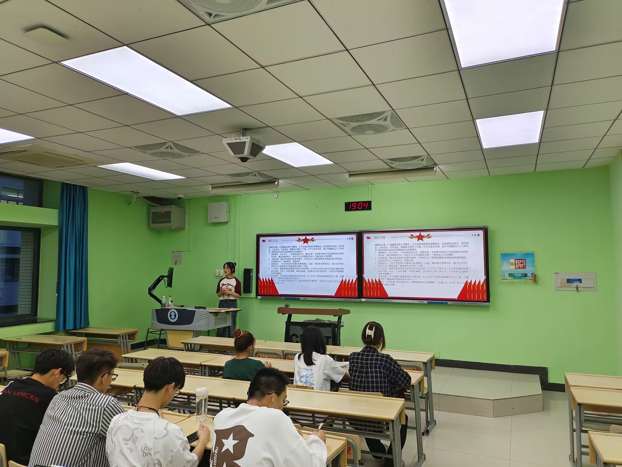 主持人钱子璇首先从活动背景开展团课宣讲。我国14亿多人口整体迈进现代化社会,规模超过现有发达国家人口的总和,其艰巨性和复杂性前所未有,必须把发展的主导权牢牢掌握在自己手中。国家安全与我们每个人的日常生活息息相关,通过此次团日活动,倡议大家从身边细节做起,维护国家安全。接着主持人开始进入第二部分“你们了解到或切身体会到的国家安全有哪些?”,主持人就这一问题展开随机问答,同学们就此问题纷纷发表了自己的看法。随后第三部分“基本知识学习”,国家安全是指国家政权、主权、统一和领土完整、人民福祉、经济社会可持续发展和国家其他重大利益相对处于没有危险和不受内外威胁的状态,以及保障持续安全状态的能力。接着展开第四部分“与自身的联系”,呼吁大家认识到大学生作为国家未来的栋梁,提出有许多方式可以在日常生活中为维护国家安全做出贡献。团课最后,主持人做了小结,让大家认识到通过这些方式,大学生不仅能够在个人层面上为维护国家安全做出贡献,还能够影响和带动周围的人共同参与到国家安全的维护工作中来。