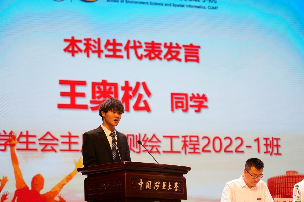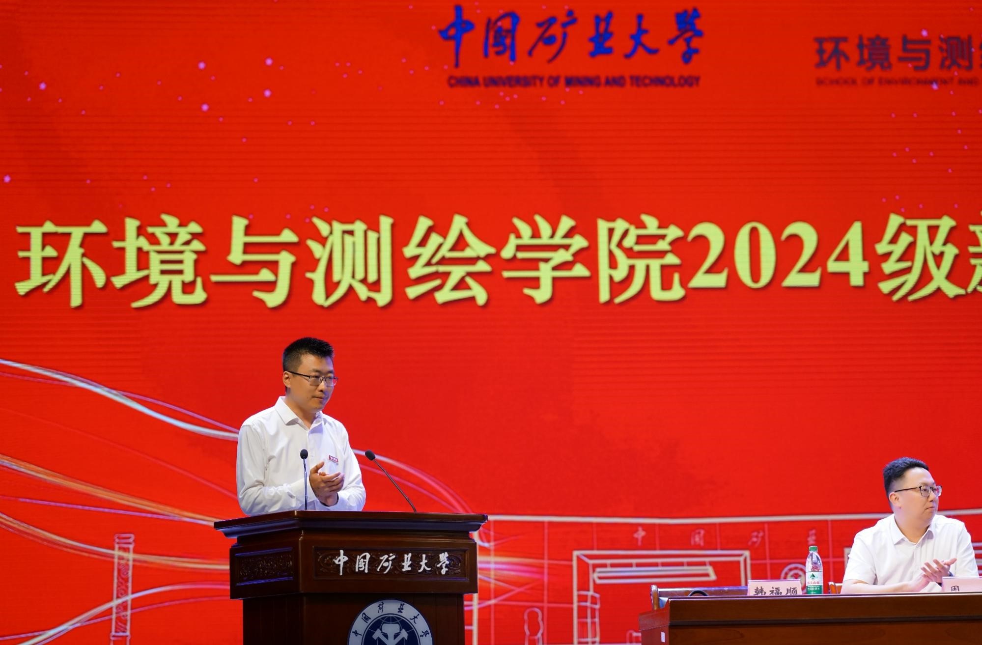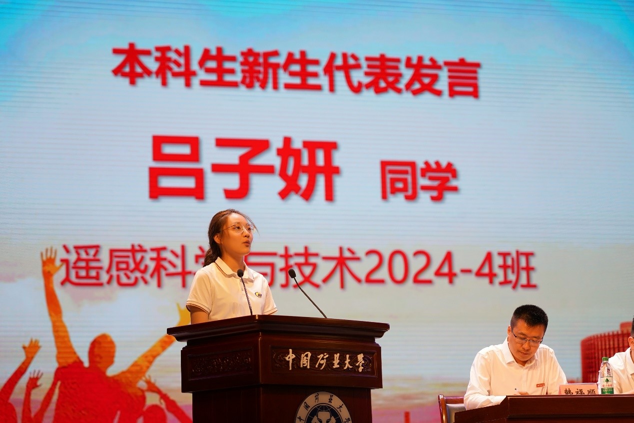 这片充满机遇与挑战的土地上,找到属于自己的舞台、实现自己的梦想。院学生会主席王奥松同学作为本科生代表结合自己对大学意义的体会,希望同学们可以在大学四年立远大理想,把握机会实现人生的无限可能。2021级环境工程博士朱燕峰代表研究生发言,他分享了自己学习和科研生活的经历与感悟,强调要拥有“感恩心、进取心、平常心”,希望同学们可以不畏艰难,一路向前。遥感科学与技术2024-4班吕子妍作为本科新生代表发言,分享了自己对矿大的印象以及对大学生涯的美好展望,希望与新生学子们共同进步。