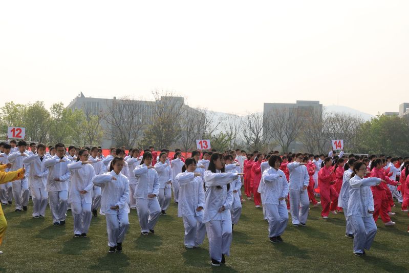 太极拳代表队身着纯白色太极服,在舒缓的音乐中,他们动作开合有序,或急或缓,张弛有度,充分展现了太极拳刚柔并济,动静结合的特点,表现出当代大学生飘逸潇洒却又阳刚威武的形象。