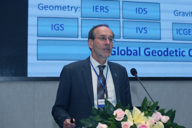 国际专家Harald Schuh教授在致辞中表示,很高兴参加论坛并作学术交流。作为国际大地测量协会现任主席,他向与会嘉宾展示了国际大地测量协会架构,并期待有更多学者关注和参与协会工作。