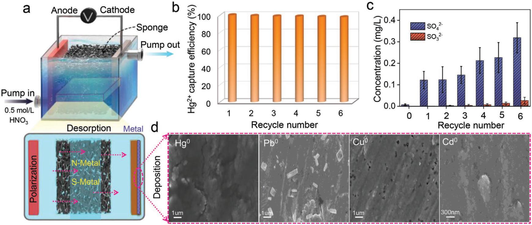 可回收性:吸附上重金属离子的硫化PAN滤材可通过施加正电压将吸附的金属离子脱离滤材表面(图3a)。在电场驱动下,这些金属离子朝对电极迁移,并在对电极上以单质形式沉积下来(图3d)。该过程同时完成滤材净化与重金属回收,一举两得。再生6次的电极每次对Hg2+的吸附效果未表现出明显降低(图3b)。虽然溶液中检测到些许从硫化PAN滤材上溶出的SO32-与SO42-(图3c),但水体中的硫含量仍在安全浓度范围内。