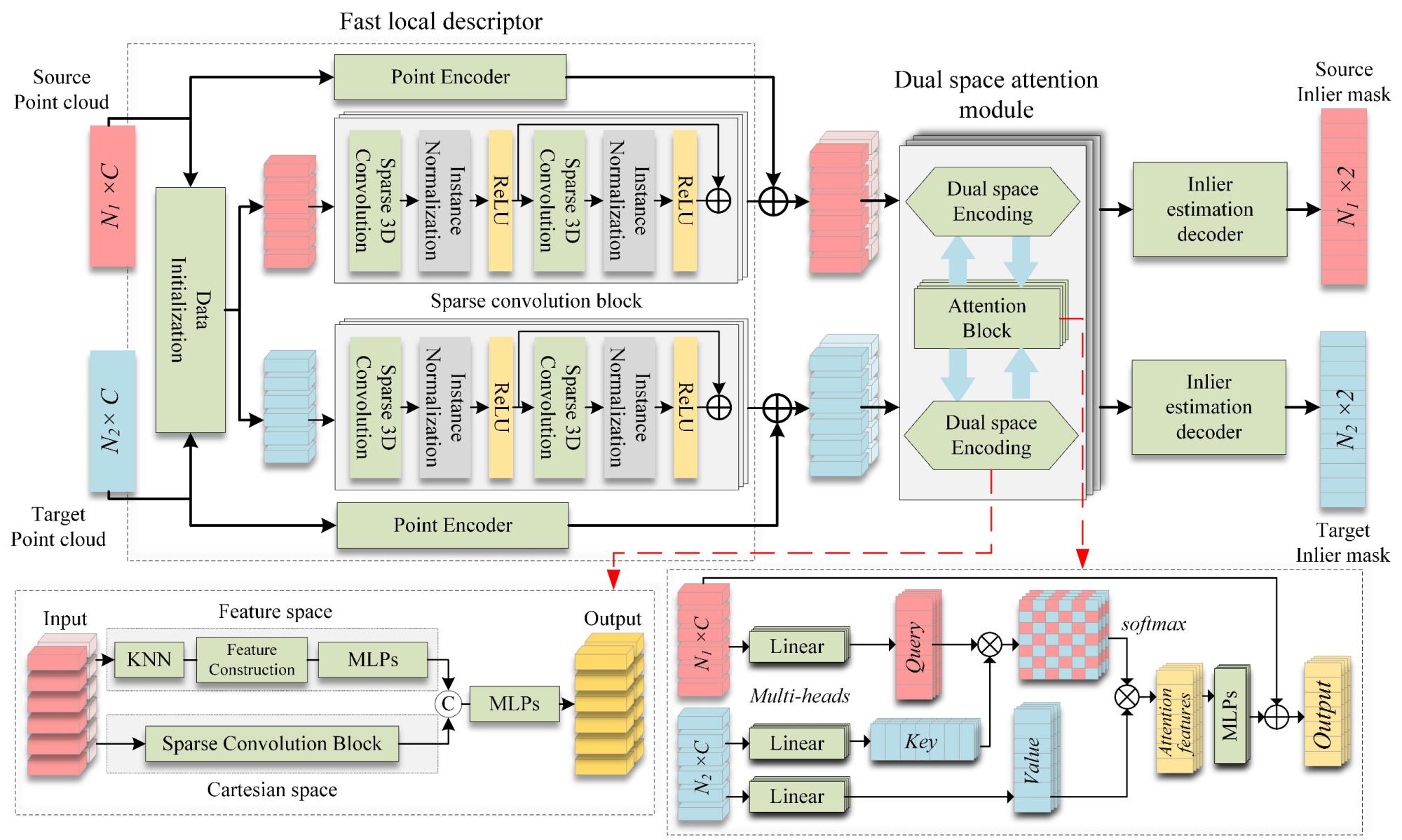 《Fore-Net: Efficient inlier estimation network for large-scale indoor scenario》(Doi://doi.org/10.1016/ J.ISPRSJPRS.2022.01.001)面向复杂室内空间环境对点云数据质量的影响,提出了一个实时化的点云滤波网络。该网络不仅可以有效优化原始点云的数据质量,且能够在点云噪声与点云稀疏性等因素的影响下保持算法的稳健,作为配准等后续任务的前置滤波模块可显著增强算法的性能,具有一定的场景泛化能力。论文以直播露点