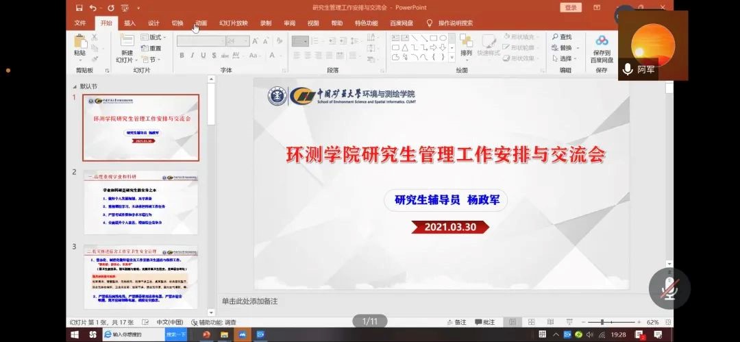 根据当前国内外疫情形势,杨政军老师要求全体研究生骨干全力配合做好疫情防控工作,认真及时做好每日信息摸排和上报工作,督促同学们按时完成日报告和晚点名,落实疫情防控举措。杨政军老师为同学们阐述了疫情防控下直播露点最新的请假制度和返校规定,要求研究生全体骨干构建好研究生日常管理等精细化体系,精准发现问题,建立完善的学生工作网格。