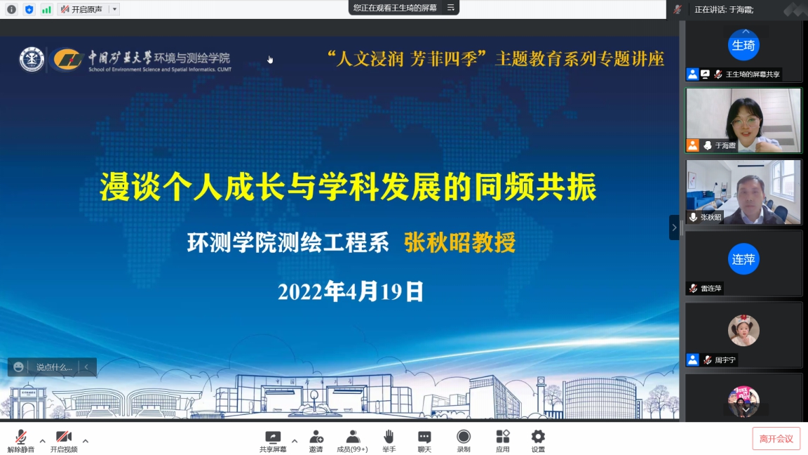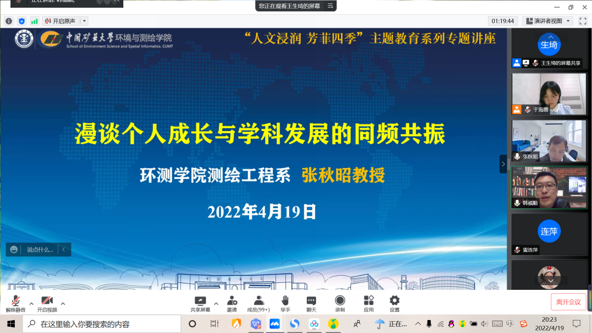 举办了主题为“人文浸润、芳菲四季”的线上教育讲座,讲座邀请了测绘工程系张秋昭教授作“漫谈个人成长与学科发展的同频共振”主题报告。院党委副书记韩福顺,学工办主任于海霞以及2019级学生参加了本次讲座。