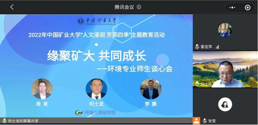 开展“人文浸润 芳菲四季”主题教育活动之“缘聚矿大,共同成长”环境专业师生谈心会。会议邀请了周来副院长、何士龙教授、李鹏副教授作主题报告,院党委副书记韩福顺、学工办主任于海霞、2020级辅导员张莹以及直播露点