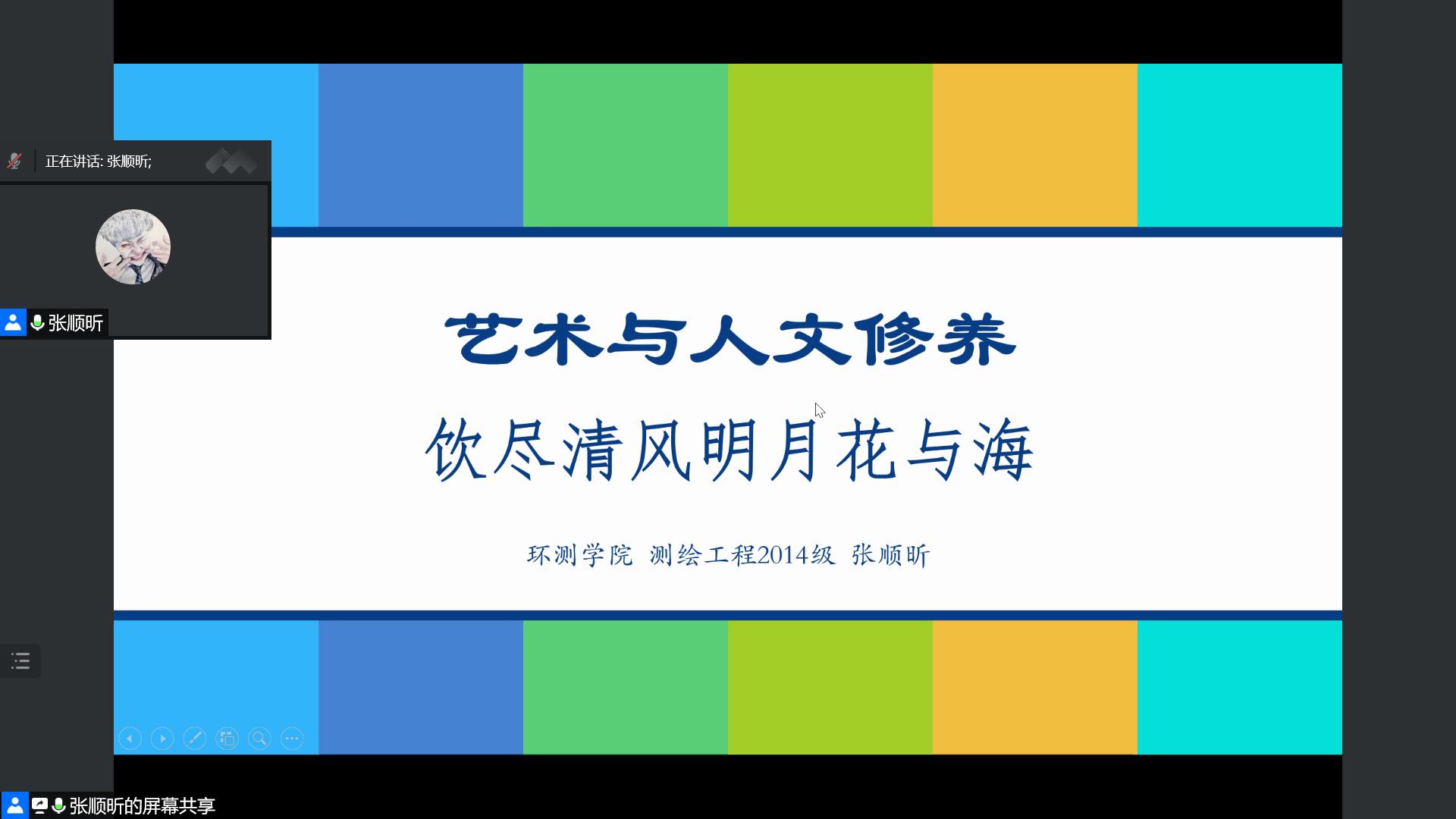 6月1日晚,张顺昕以“艺术与人文修养——饮尽清风明月花与海”为题,从艺术来源、自身经验、如何提升艺术修养、艺术修养与文化自觉四个方面进行了讲解。关于提升艺术修养的方法,张顺昕认为最重要的是要学会欣赏美、发现美,他建议大家可以利用闲暇时间多阅读、观看画展或者话剧,扩大自己的欣赏视野,而不局限于一种艺术流派。