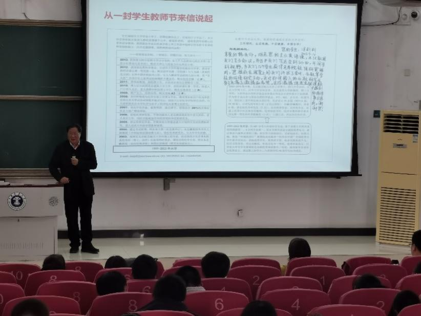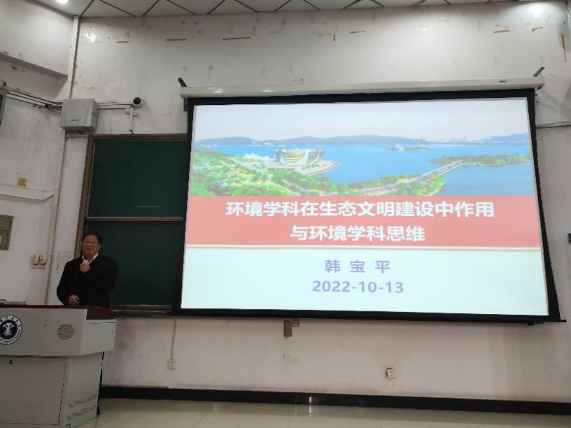 环境学科为区域生态环境质量提升做出的贡献;其次他介绍了我国新时代环境形势、压力和挑战,结合自己的亲身经历,勉励青年教师、在校学生要有大的学科格局,学好环境学科专业知识,练就专业本领;第三,他重点从环境问题的尺度效应、环境系统思维、环境生态理念三个层面系统阐述了环境学科的思维特点。报告最后,他结合国内外当前形势,对新同学提了四点希望,希望同学们做担当民族复兴大任的时代新人,做新时代的追梦人。听讲师生认真记录,现场学术氛围热烈,报告不仅开拓了学术视野,启发了学术思维,也注入了满满的正能量。