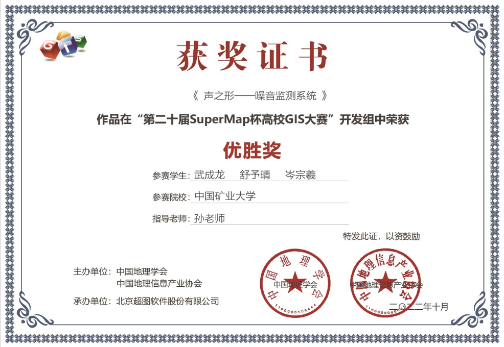 学子武成龙、舒予晴、岑宗羲组成的参赛小组在本次大赛中的作品《声之形——噪声监测系统》获得了开发组组参赛类别的优胜奖。