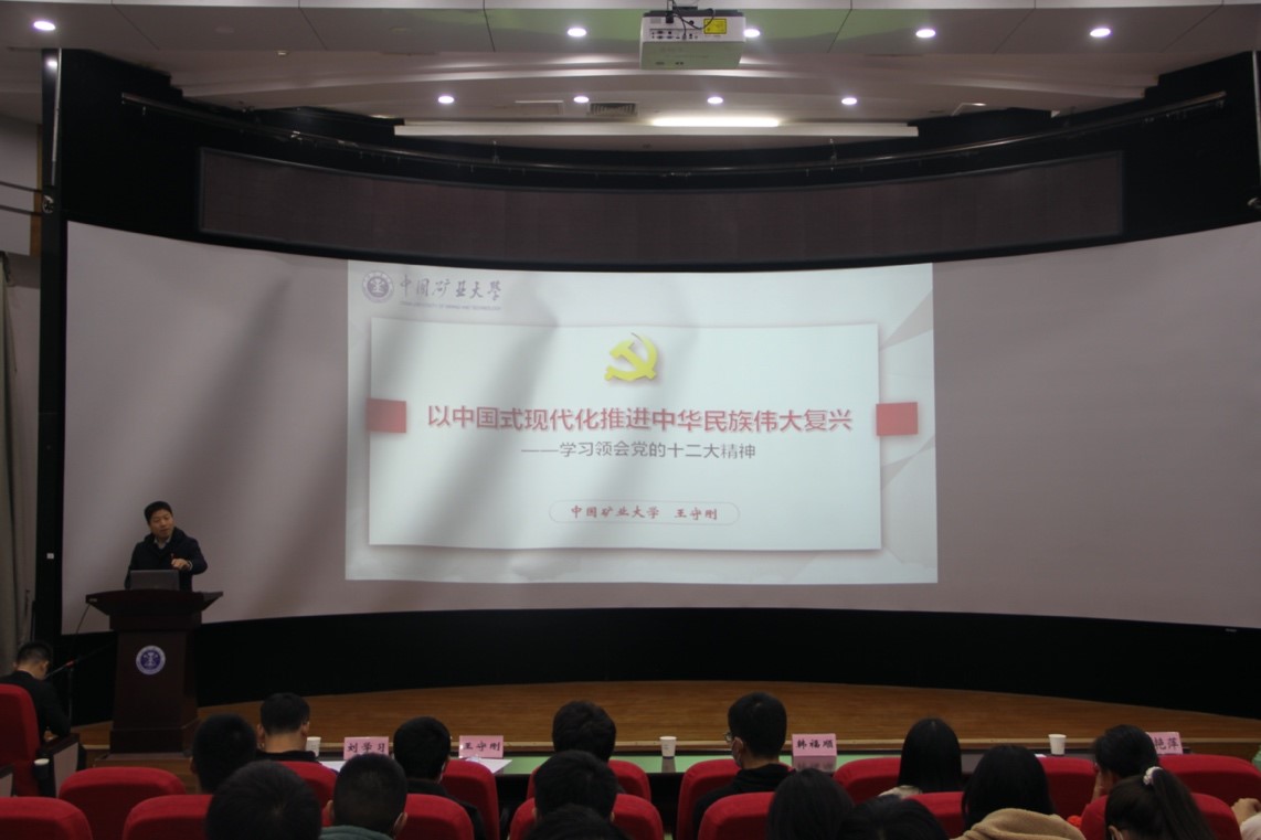 在报告中,王守刚书记从党的二十大筹备过程、主要议程、主要成果和大会主题,新时代十年的伟大变革,马克思主义中国化时代化新境界,中国式现代化的理论和实践突破,新时代新征程中国共产党的历史使命,全面建设社会主义现代化国家的目标任务,新时代党的建设新的伟大工程,历史背景和风险挑战,当代青年的历史使命与责任担当等方面进行了全面介绍和系统解读。他强调当代青年大学生是中国特色社会主义建设事业的见证者、参与者和受益者,也是未来的建设者和接班人,未来人生的发展恰与中华民族伟大复兴同步。生逢盛世,每个人都大有可为。他希望新一代矿大环测学子把人生理想主动融入到国家和民族的事业中,始终向善向上,知止知至,求真求实,克勤克俭,善作善成,勇做走在时代前列的奋进者、开拓者、奉献者,努力使自己成为祖国建设的有用之才、栋梁之材,为实现中国梦奉献智慧和力量。