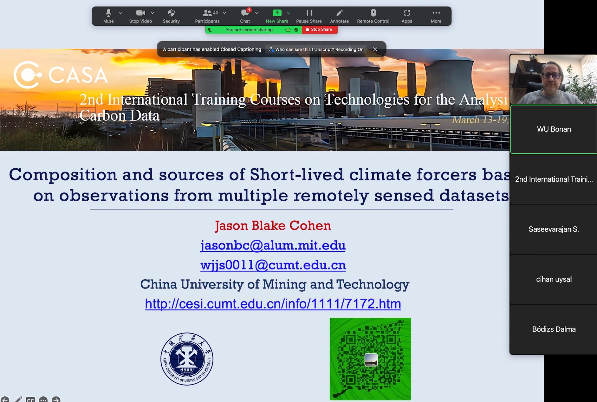Jason Cohen教授应邀以“Satellite Composition and sources of Short-lived climate forcers based on observations from multiple remotely sensed datasets”为议题授课。学员们普遍感到这次培训内容丰富、主题鲜明、重点突出,对课程安排、授课质量、组织保障等都予以充分肯定,并希望能进一步合作。