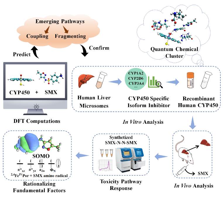 文献情报中心与美国化学会出版部2022年合作举办世界环境日健康主题期刊封面展。Environmental Science & Technology主编耶鲁大学Julie B. Zimmerman教授点评“作者提出了一种三步协同研究法,揭示了CYP450酶对新型污染物的精确生物转化机制。未来还可通过该法确定由其他非CYP450酶催化形成的对新型污染物的生物转化机制”。近年来,磺胺类抗生素的环境污染已引起广泛的关注,是国际热点环境问题之一。季力课题组针对当前环境中广受关注的磺胺抗生素类污染物的代谢路径展开研究。首先通过计算预测代谢进程中可能发生磺胺自由基碰撞产生磺胺的耦合产物,这一推测产物随后得到了人肝微粒体体外实验的验证,并且进一步得到了小鼠体内实验的确认,在随后的毒性评估实验中发现该耦合产物可对脂质代谢造成干扰而构成潜在的人体健康风险。这是在国际上首次报道了磺胺抗生素耦合代谢产物的存在。最终通过对磺胺自由基的基本性质研究发现自旋离域导致氨基自由基的供电子能力减弱是磺胺发生耦合的本质因素,从而该机理可推广到所有磺胺和含氨基类化合物的代谢进程,直接作用于胺类新污染物的生物监测。该工作于3月15日以封面论文在线发表于Environmental Science & Technology(//pubs.acs.org/doi/10.1021/acs.est.3c00071)。