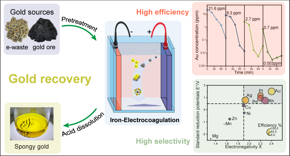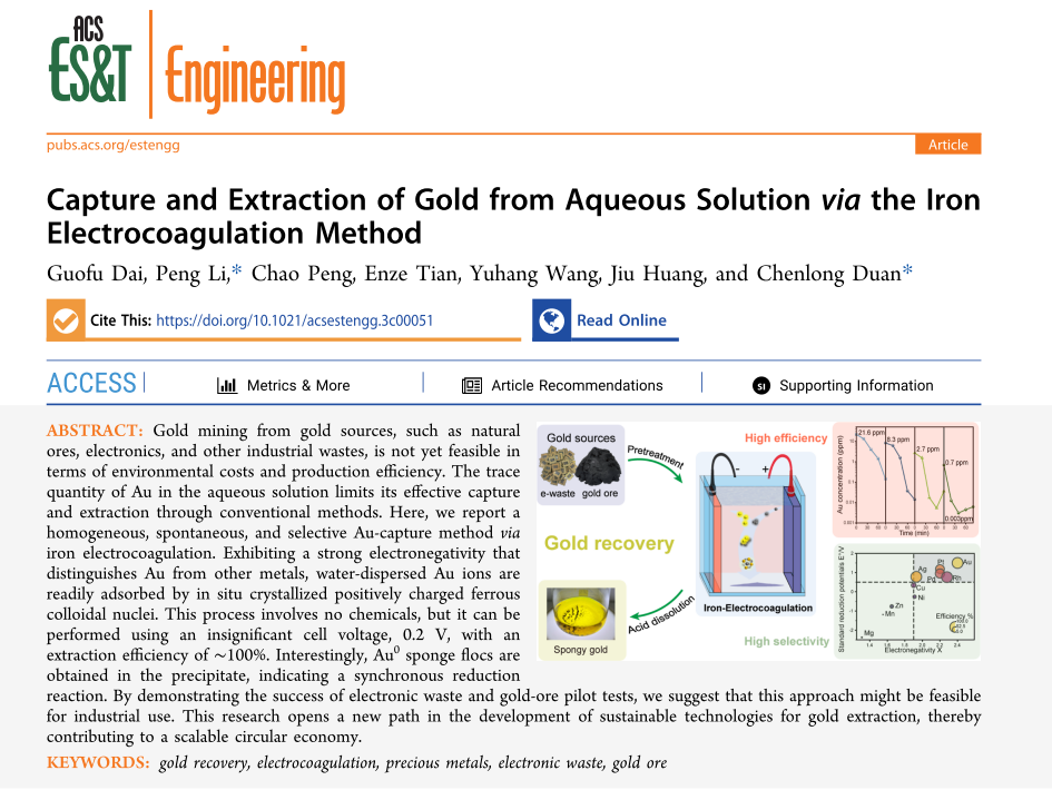 李鹏副教授开发了液相痕量Au、Ag贵金属选择性提取技术,绿色高效提取溶浸液、尾矿浸出液中的Au、Ag贵金属。利用电化学反应原位捕获液相中的贵金属,金、银贵金属的捕获效率高达~99.66%;对所得沉淀絮凝物进行微观形貌观察和物理化学性质表征,扫描电子显微镜(SEM)和透射电子显微镜(TEM)观察到贵金属的聚团分布,颗粒粒径2~5 nm,不同于铜、镍等碱土金属的离散分布;X-射线光电子能谱测试表明贵金属呈单质形态存在,即捕获过程发生同步的贵金属还原。研究中揭示了贵金属电化学提取的电负性和氧化还原电位规律,为贵金属的绿色、低成本提取开辟全新的工艺技术方法。研究成果以“Capture and Extraction of Gold from Aqueous Solution via the Iron Electrocoagulation Method”为题,发表于国际环境类权威学术期刊ACS ES&T Engineering.